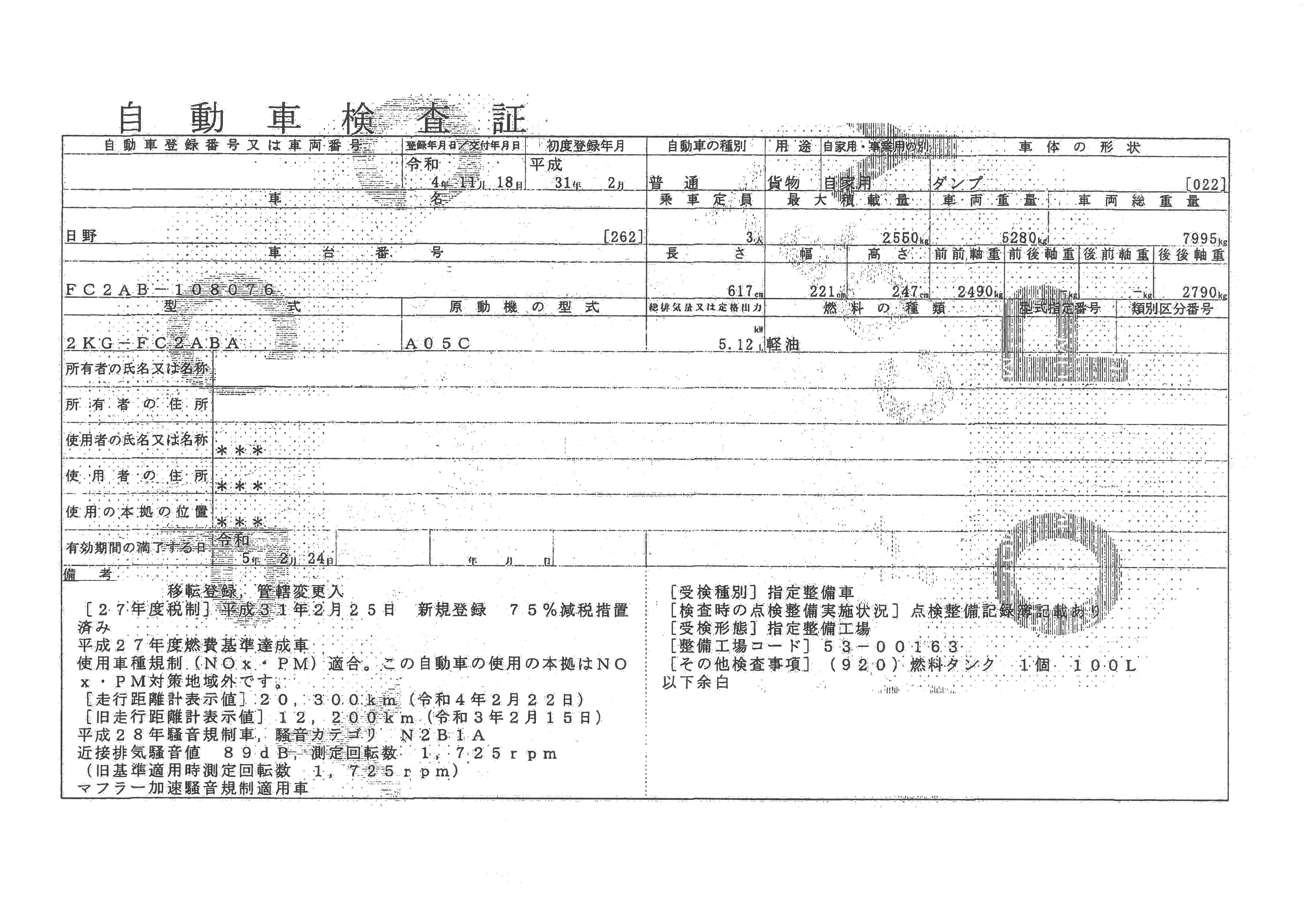 | 初年度登録 | 平成31年2月 | 型式 | 2KG-FC2ABA | 車検期限 | 一時抹消 |