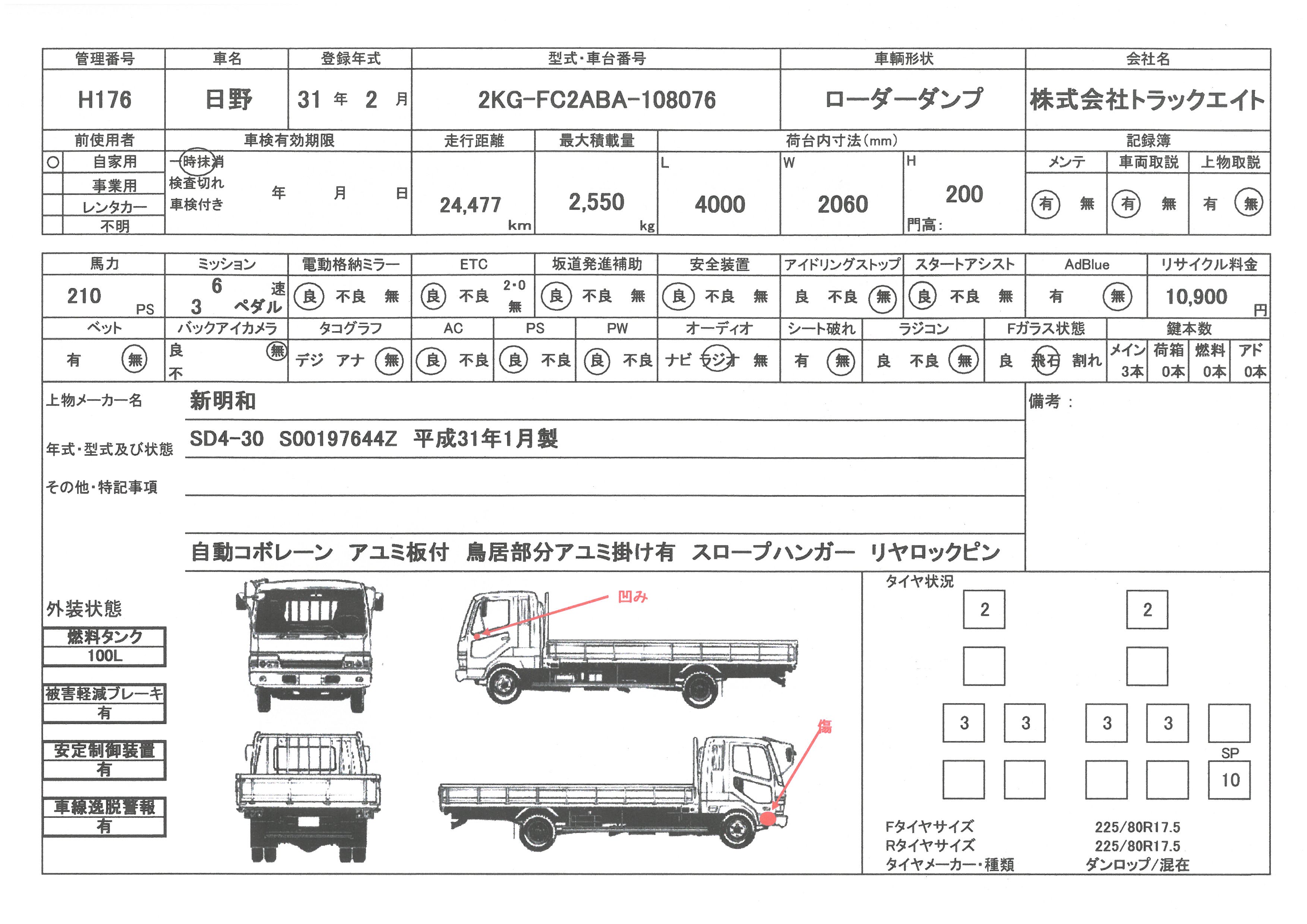 | 上物 | 新明和 | 上物形式 | SD4-30 | 荷台寸法 | 4.00×2.06×0.20 |