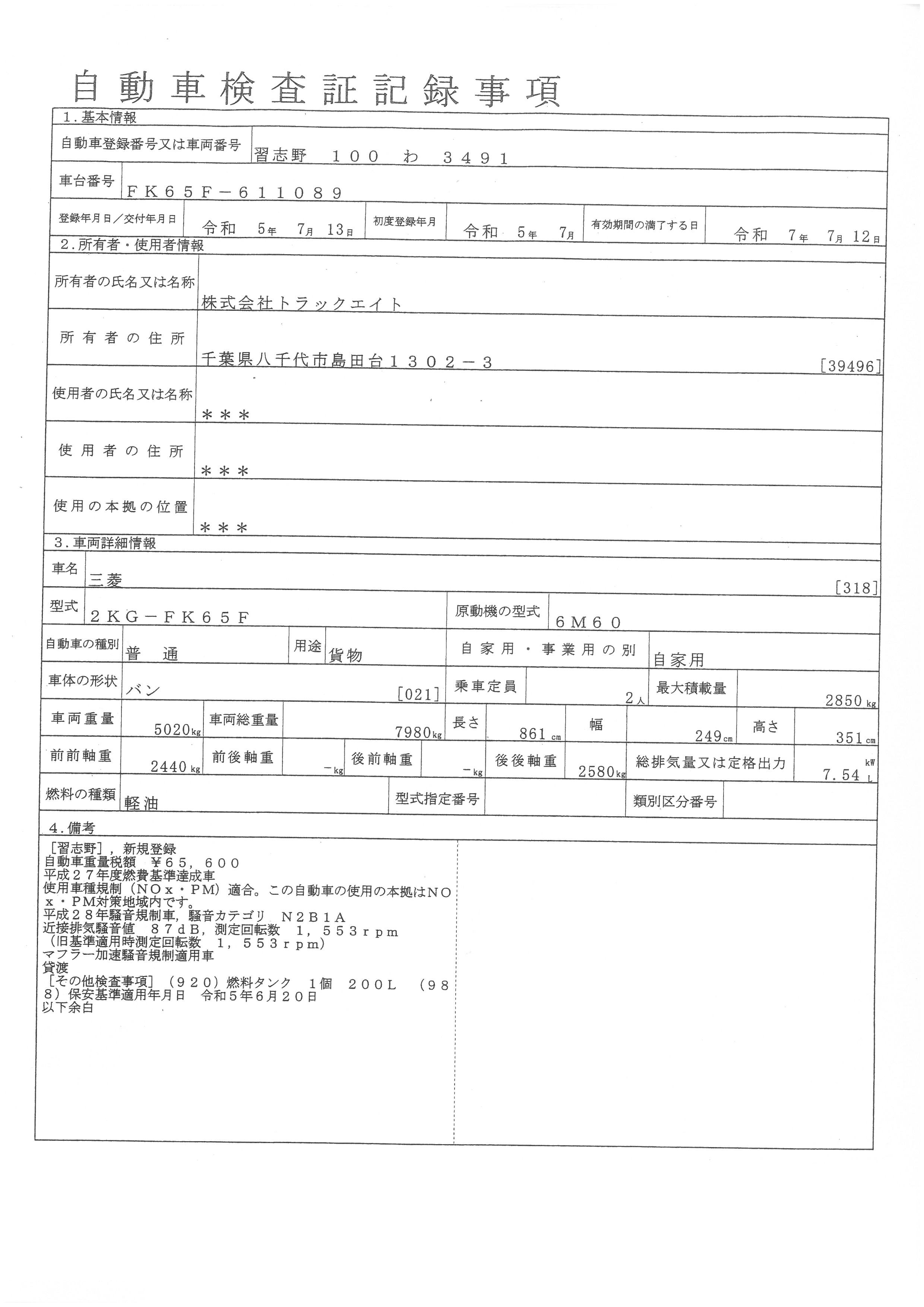 初年度登録 令和5年7月 型式 2KG-FK65F 車検期限 令和7年7月12日