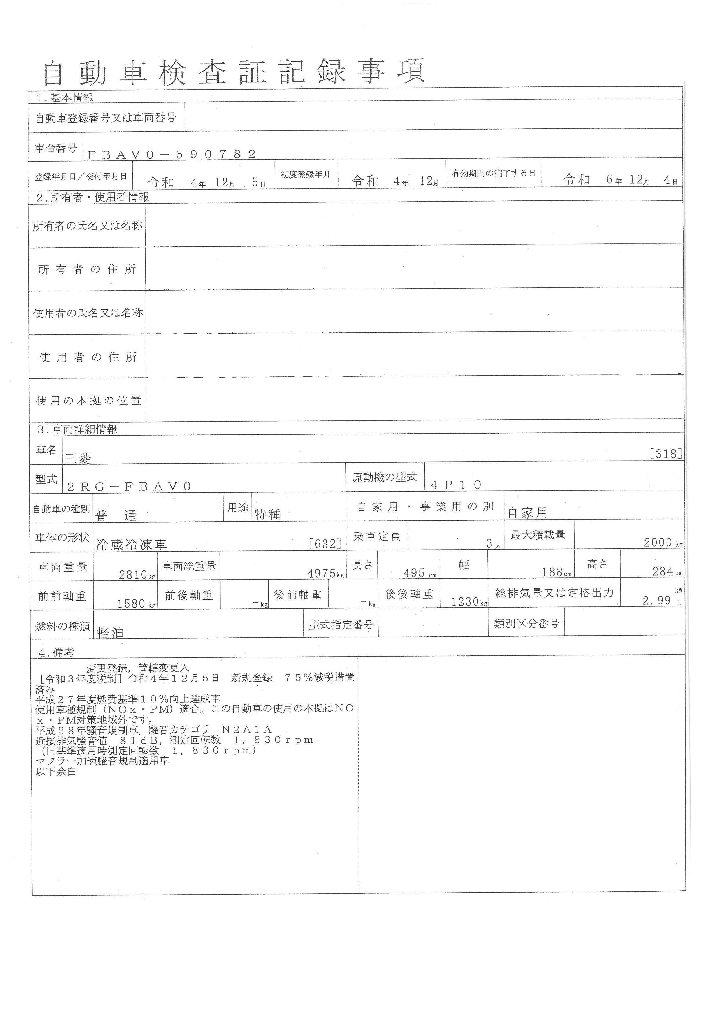 | 初年度登録 | 令和4年12月 | 型式 | 2RG-FBAV0 | 車検期限 | 一時抹消 |