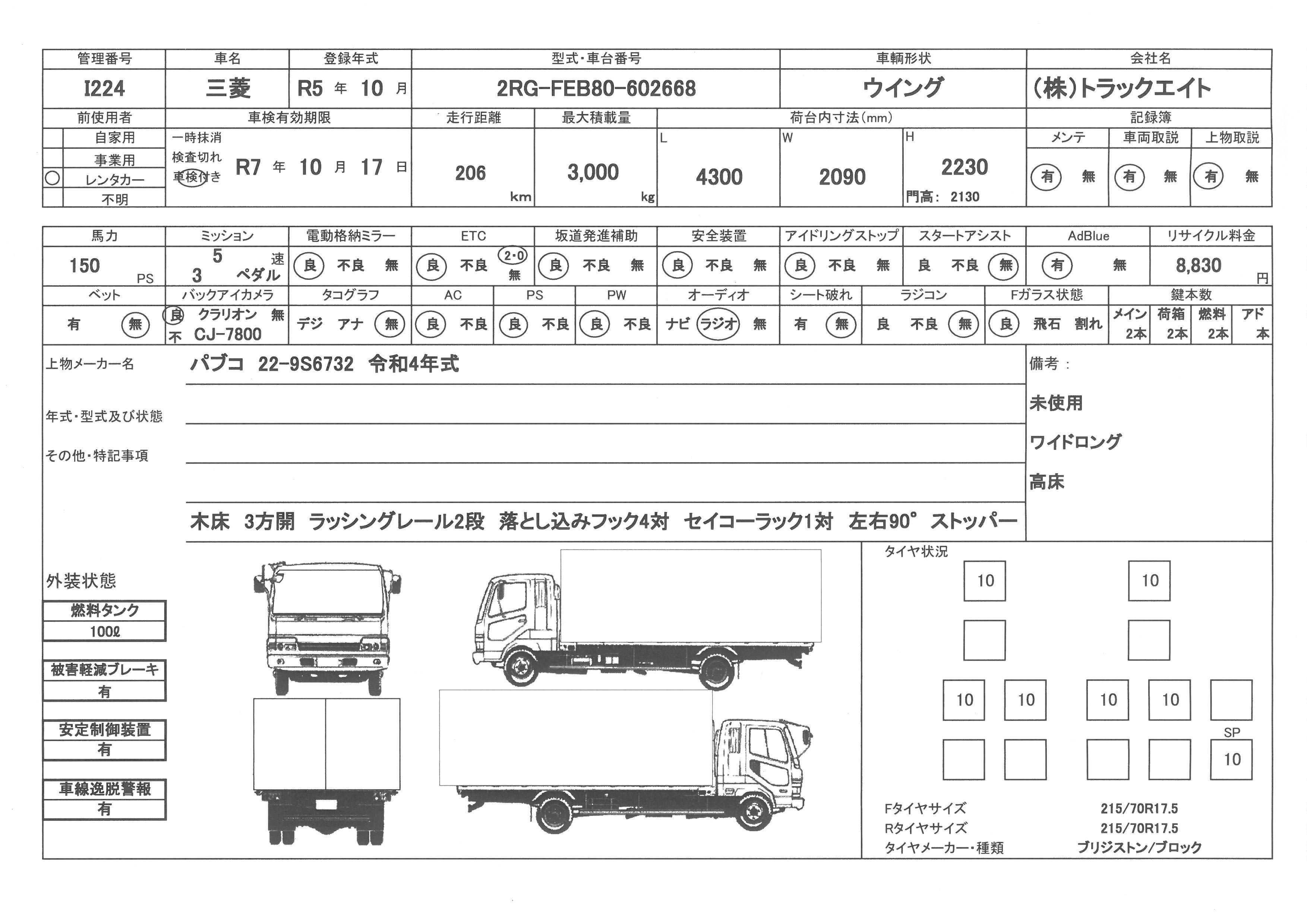 | ボディー仕様 | 木床 3方開 ラッシングレール2段 落とし込みフック4対 セイコーラック | ||||