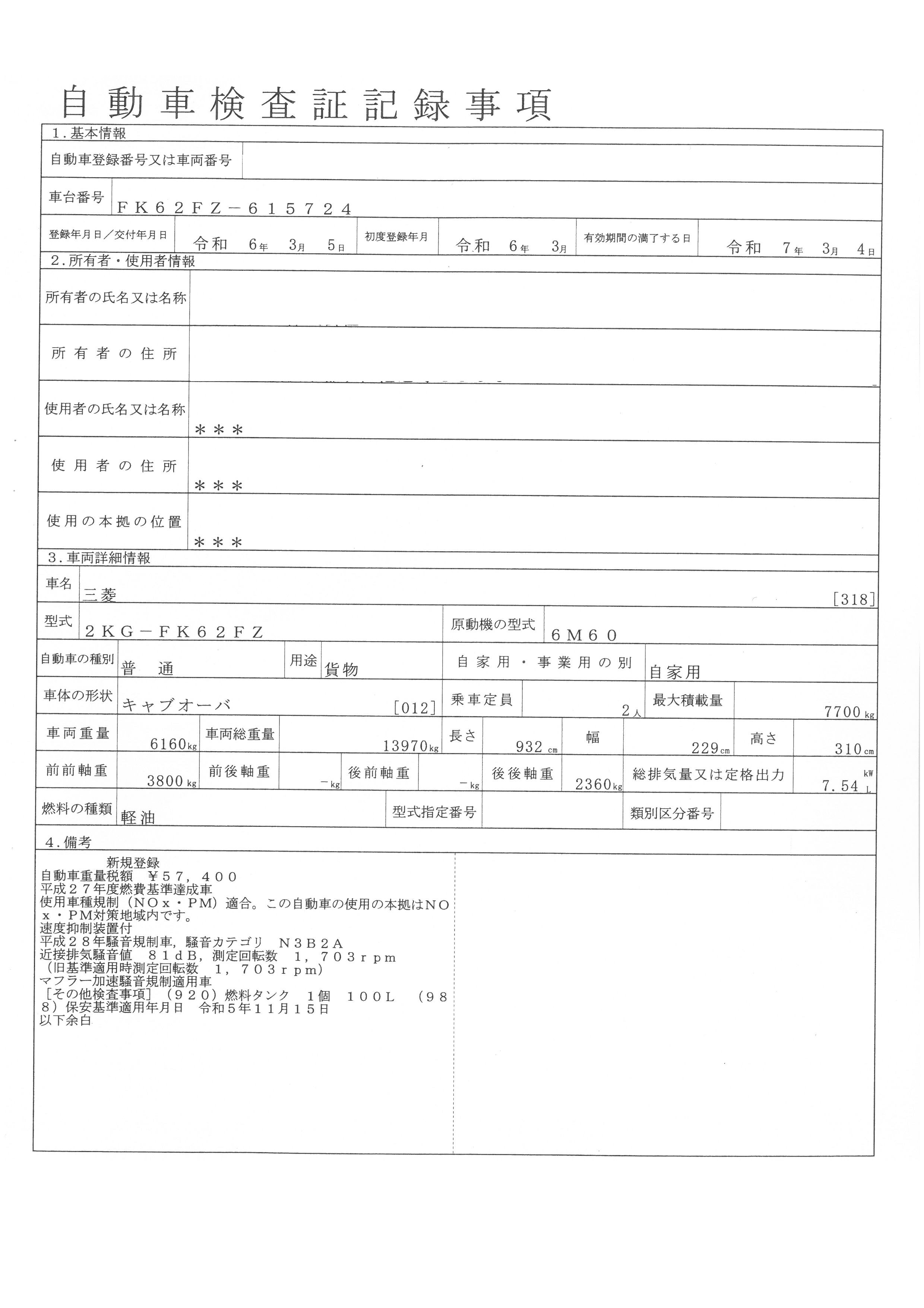 | 初年度登録 | 令和6年3月 | 型式 | 2KG-FK62FZ | 車検期限 | 令和7年3月4日 |