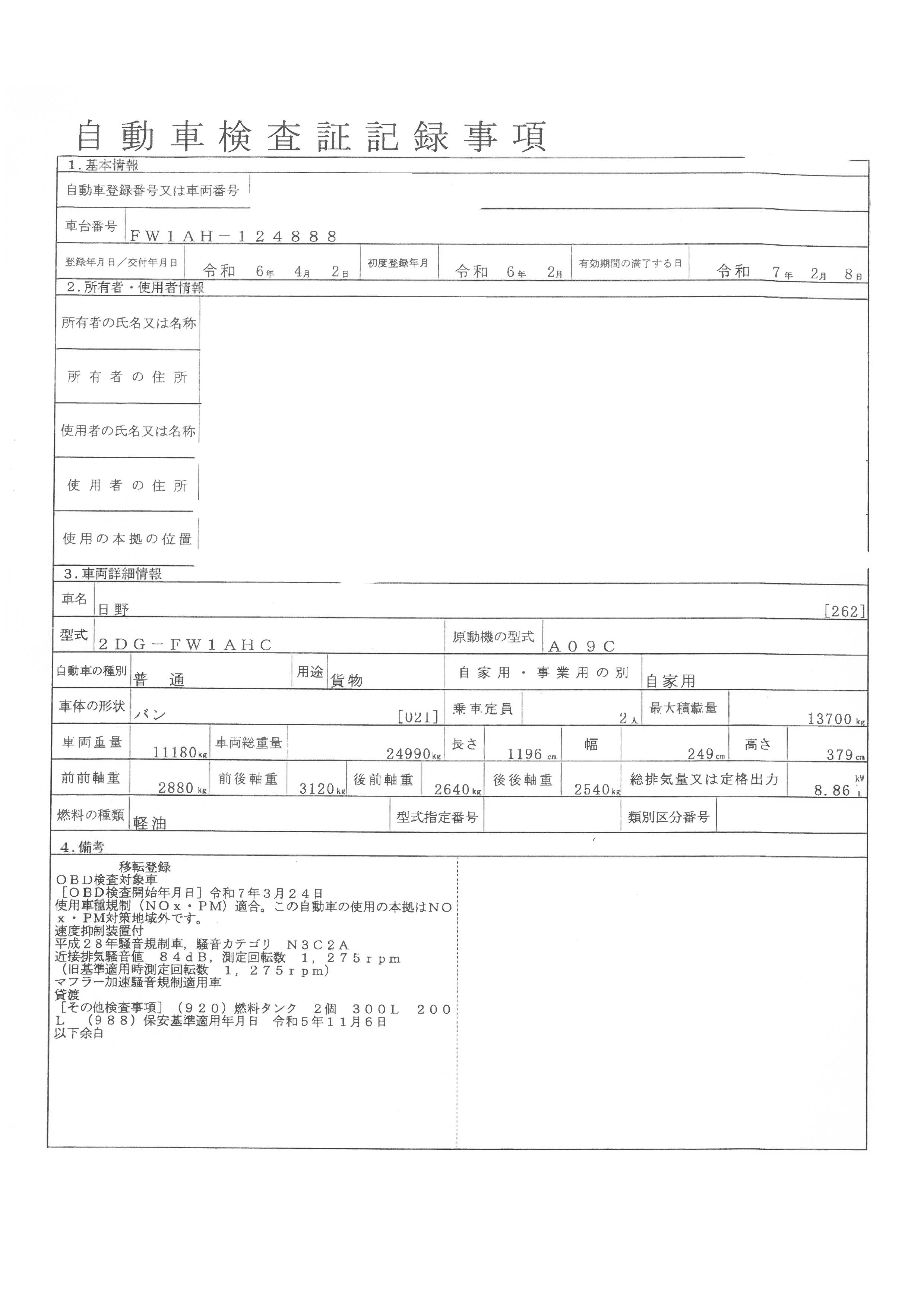 初年度登録 令和6年2月 型式 2DG-FW1AHC 車検期限 令和7年2月8日
