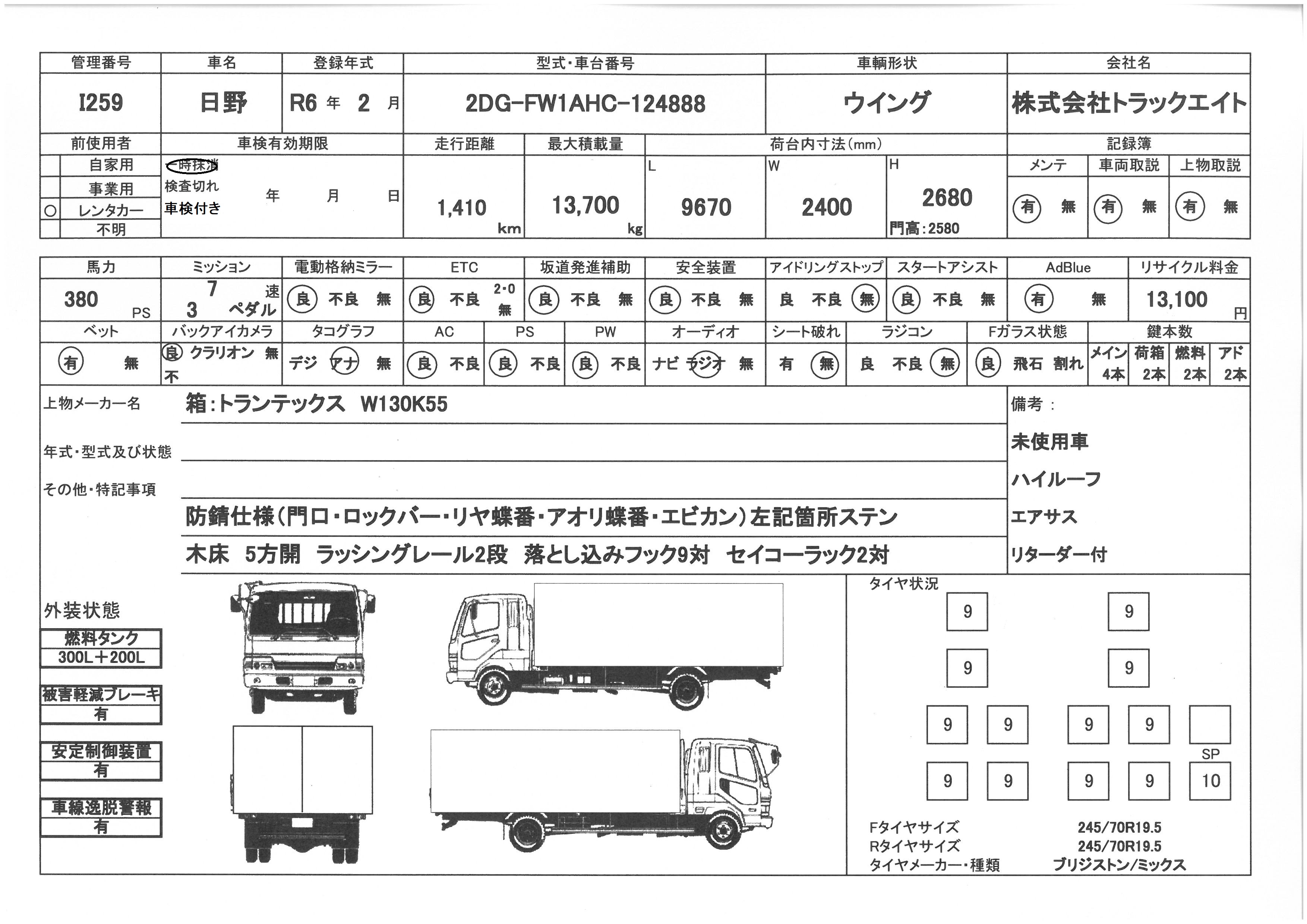 問合せ番号 I259 [八千代在庫] メーカー 日野 形状 ウイング