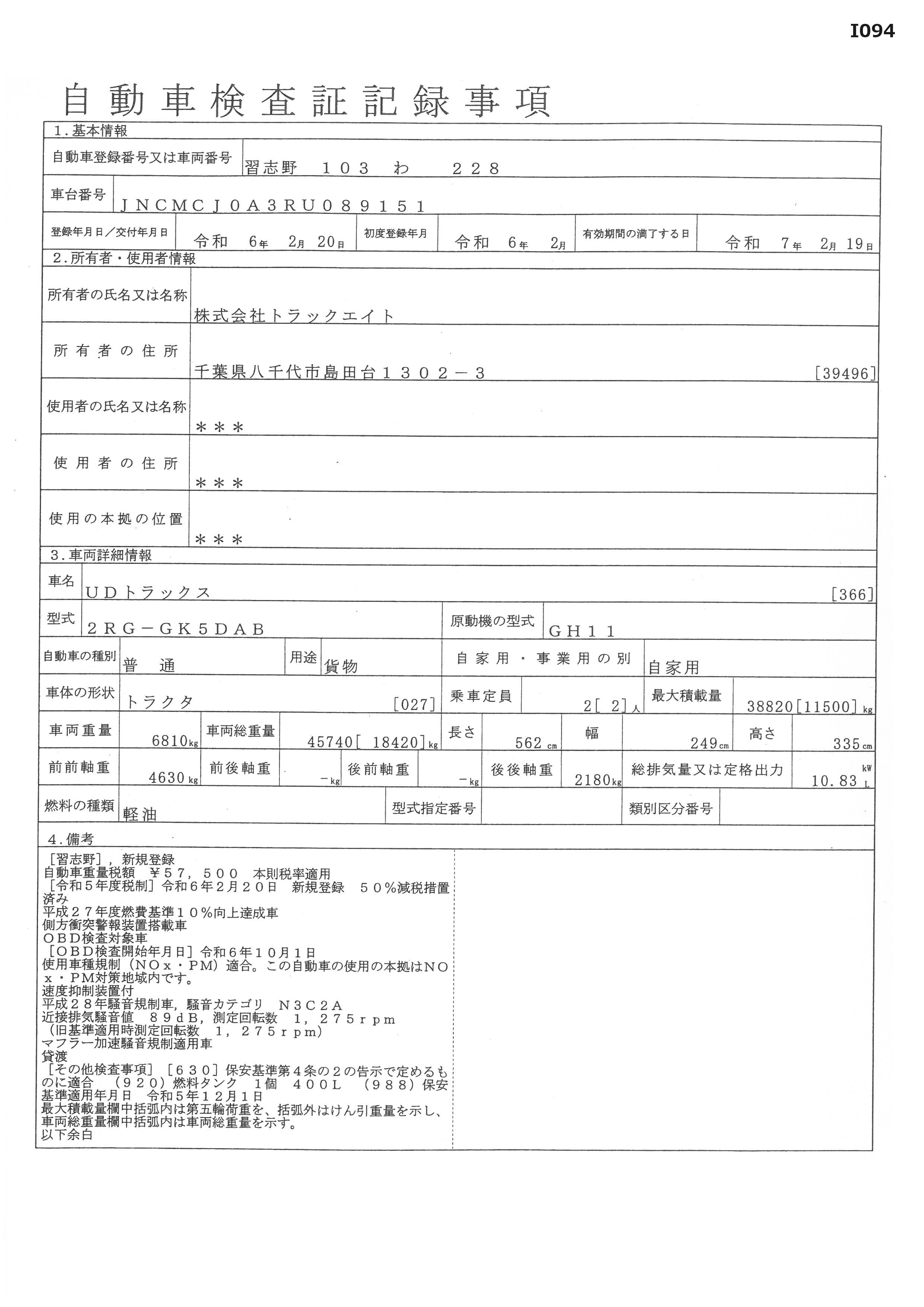 | 問合せ番号 | I094 [八千代在庫] | メーカー | UD | 形状 | トラクタ |