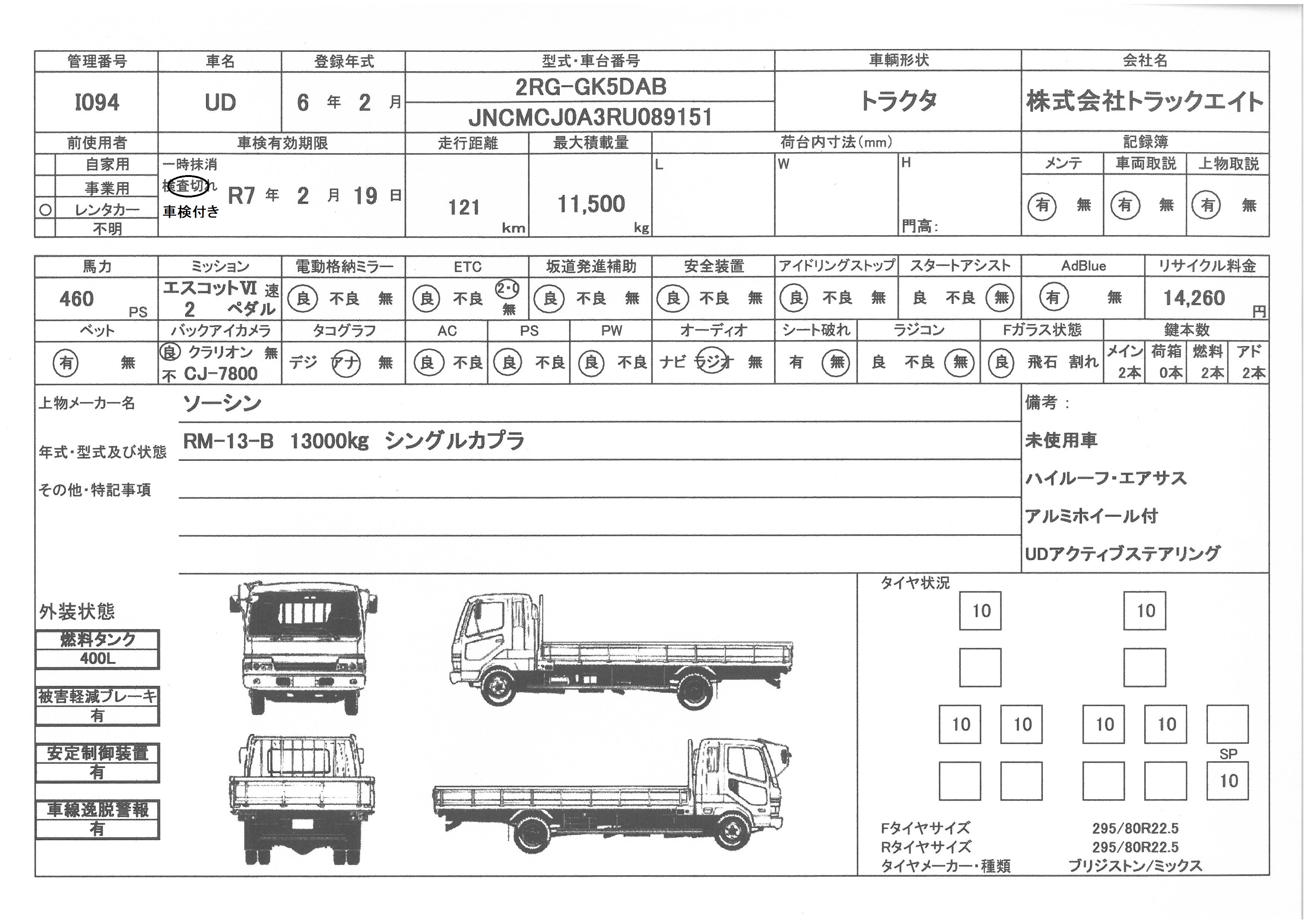 | 走行距離 | 1千km | リサイクル料 | 14260円 | 積載量 | 11500㎏ |