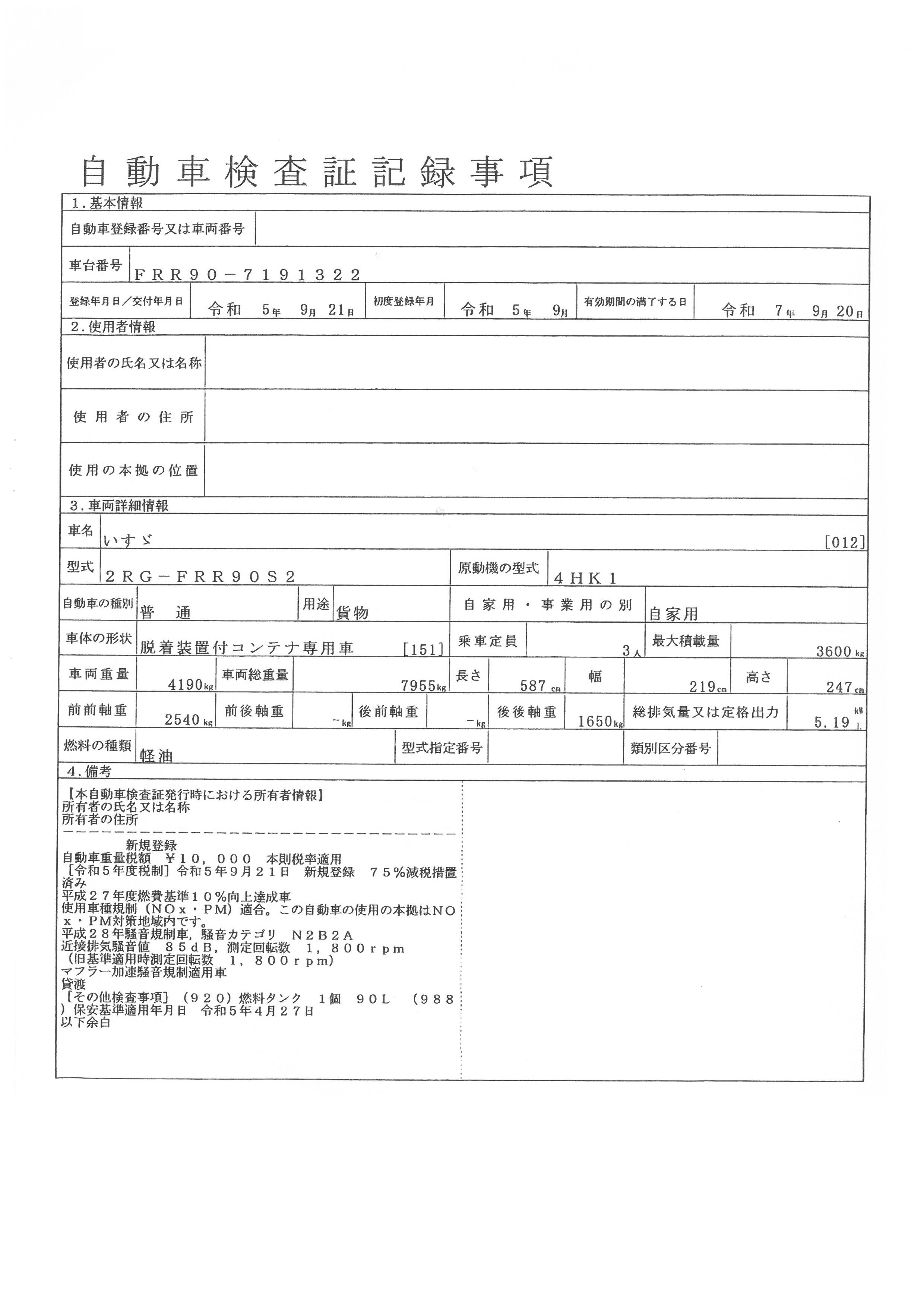 | 初年度登録 | 令和5年9月 | 型式 | 2RG-FRR90S2 | 車検期限 | 令和7年9月20日 |