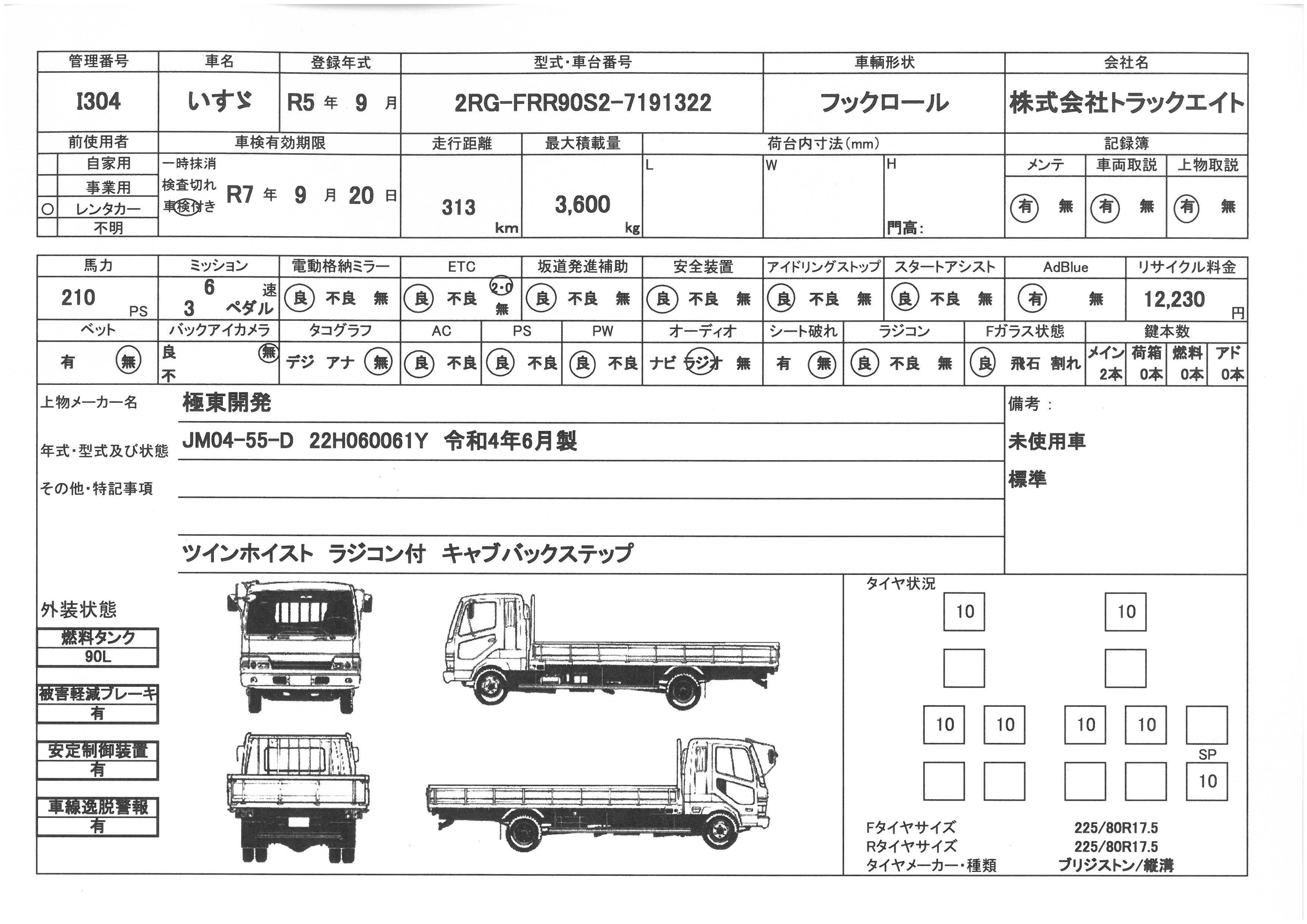 | 走行距離 | 1千km | リサイクル料 | 12230円 | 積載量 | 3600㎏ |