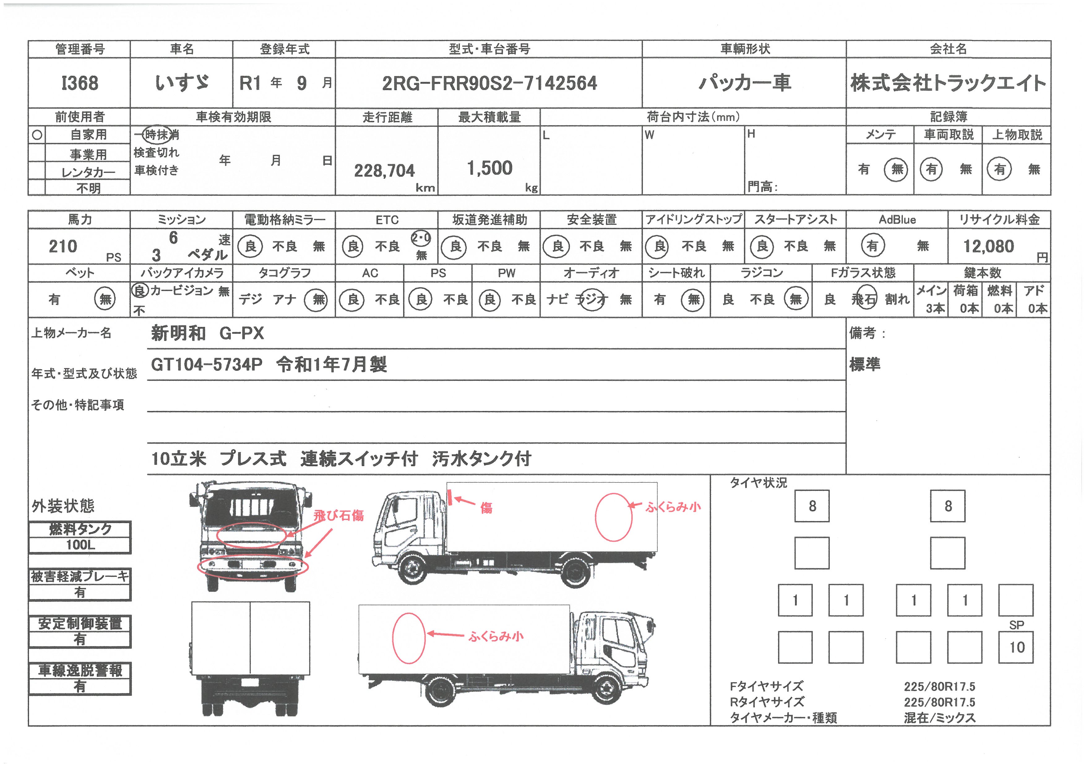 初年度登録 令和1年9月 型式 2RG-FRR90S2 車検期限 一時抹消