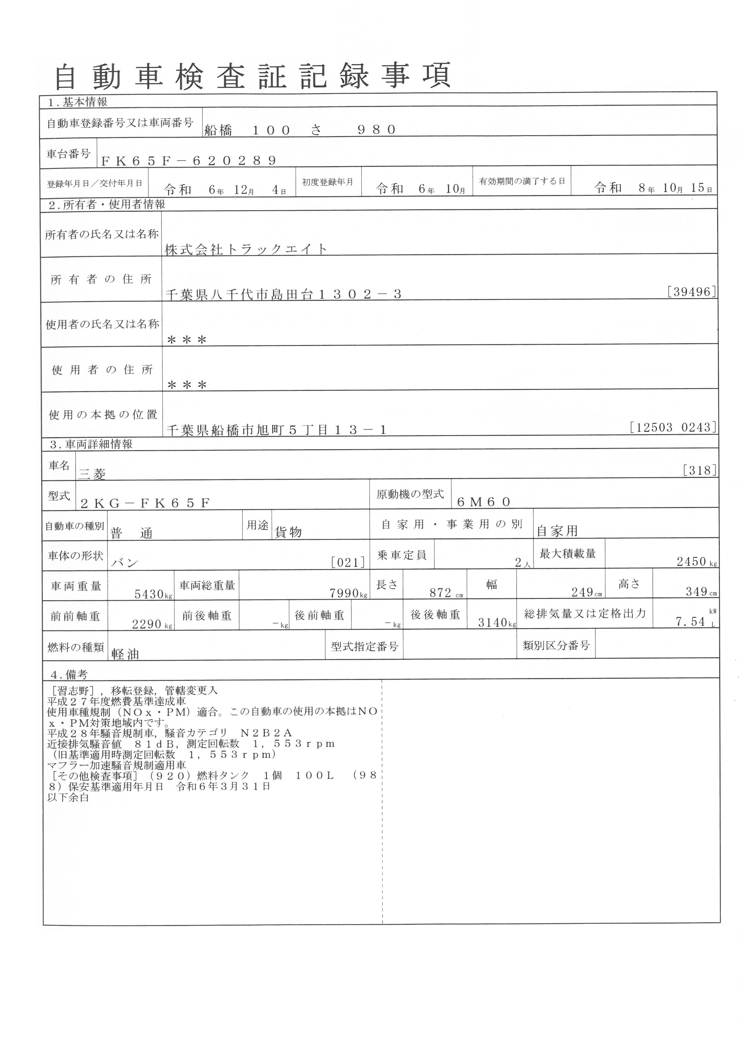 初年度登録 令和6年10月 型式 2KG-FK65F 車検期限 令和8年10月15日