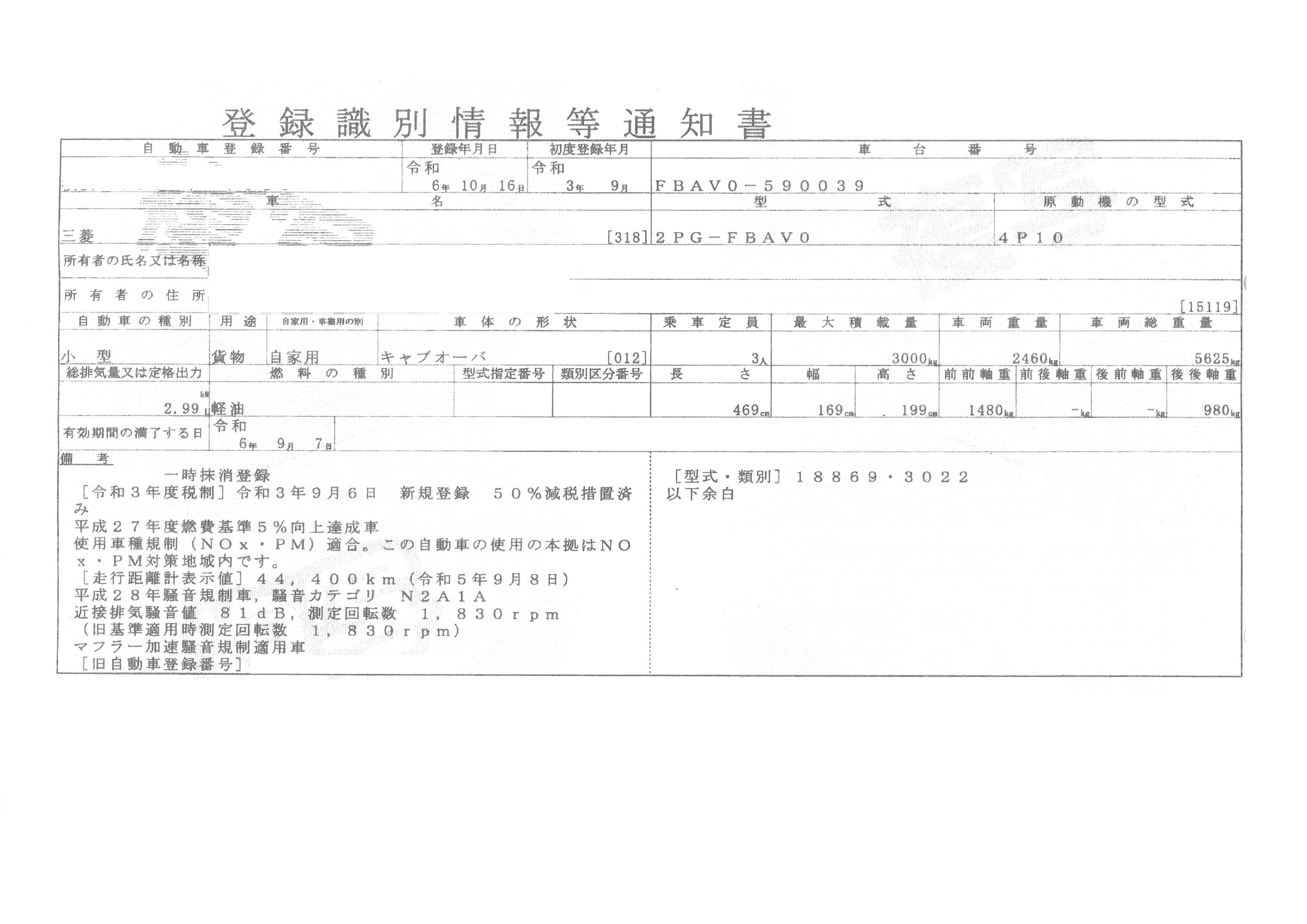 初年度登録 令和3年9月 型式 2PG-FBAV0 車検期限 一時抹消