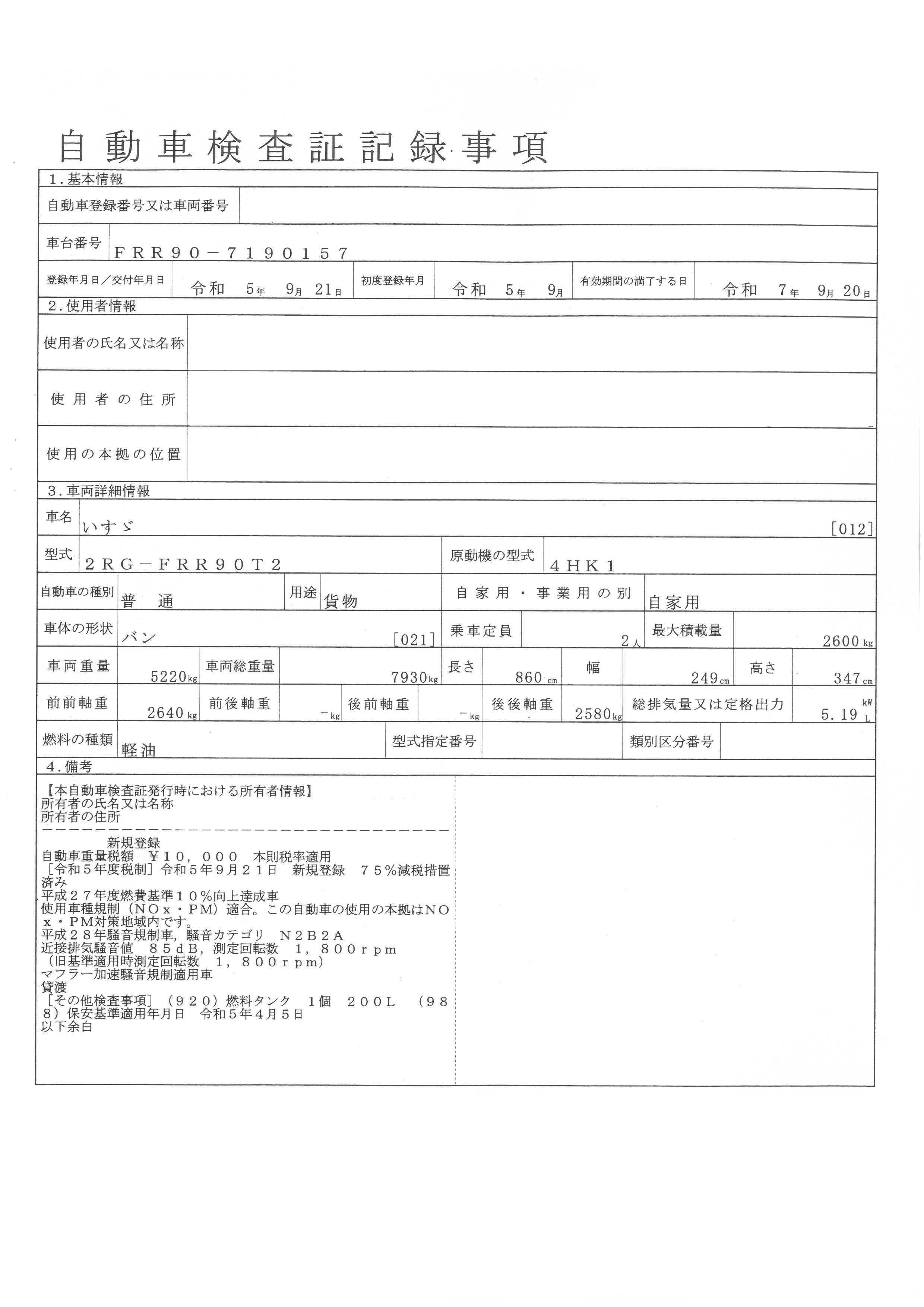 初年度登録 令和5年9月 型式 2RG-FRR90T2 車検期限 令和7年9月20日
