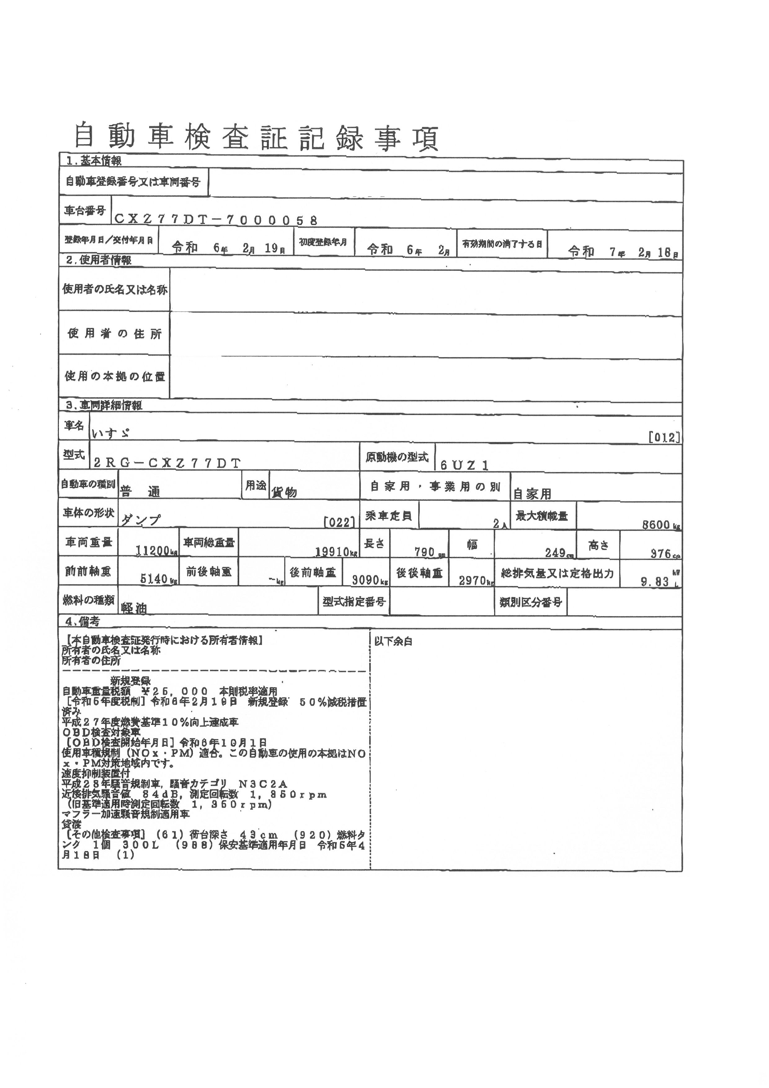 | 初年度登録 | 令和6年2月 | 型式 | 2RG-CXZ77DT | 車検期限 | 令和8年2月18日 |