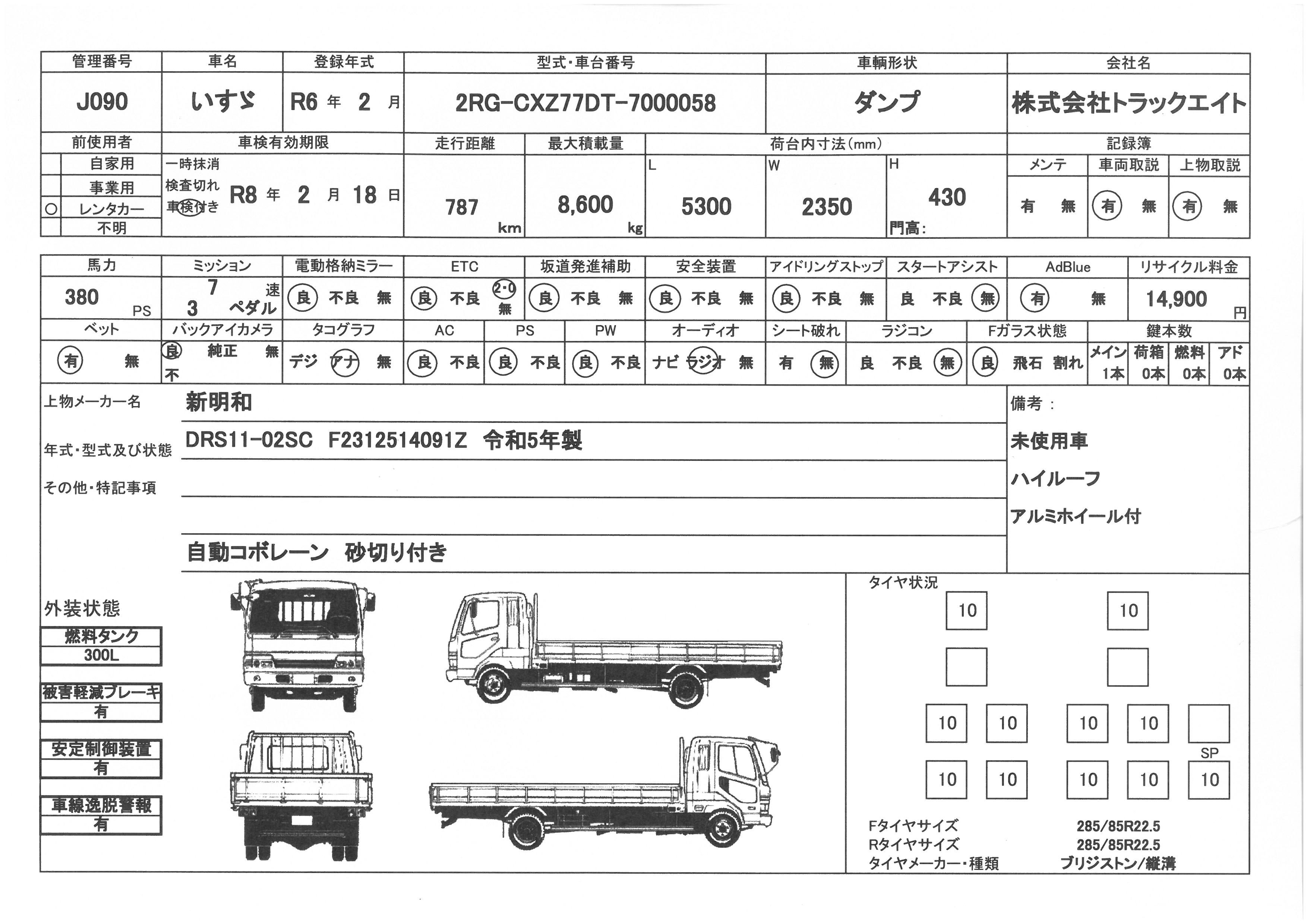 | 走行距離 | 1千km | リサイクル料 | 14900円 | 積載量 | 8600㎏ |