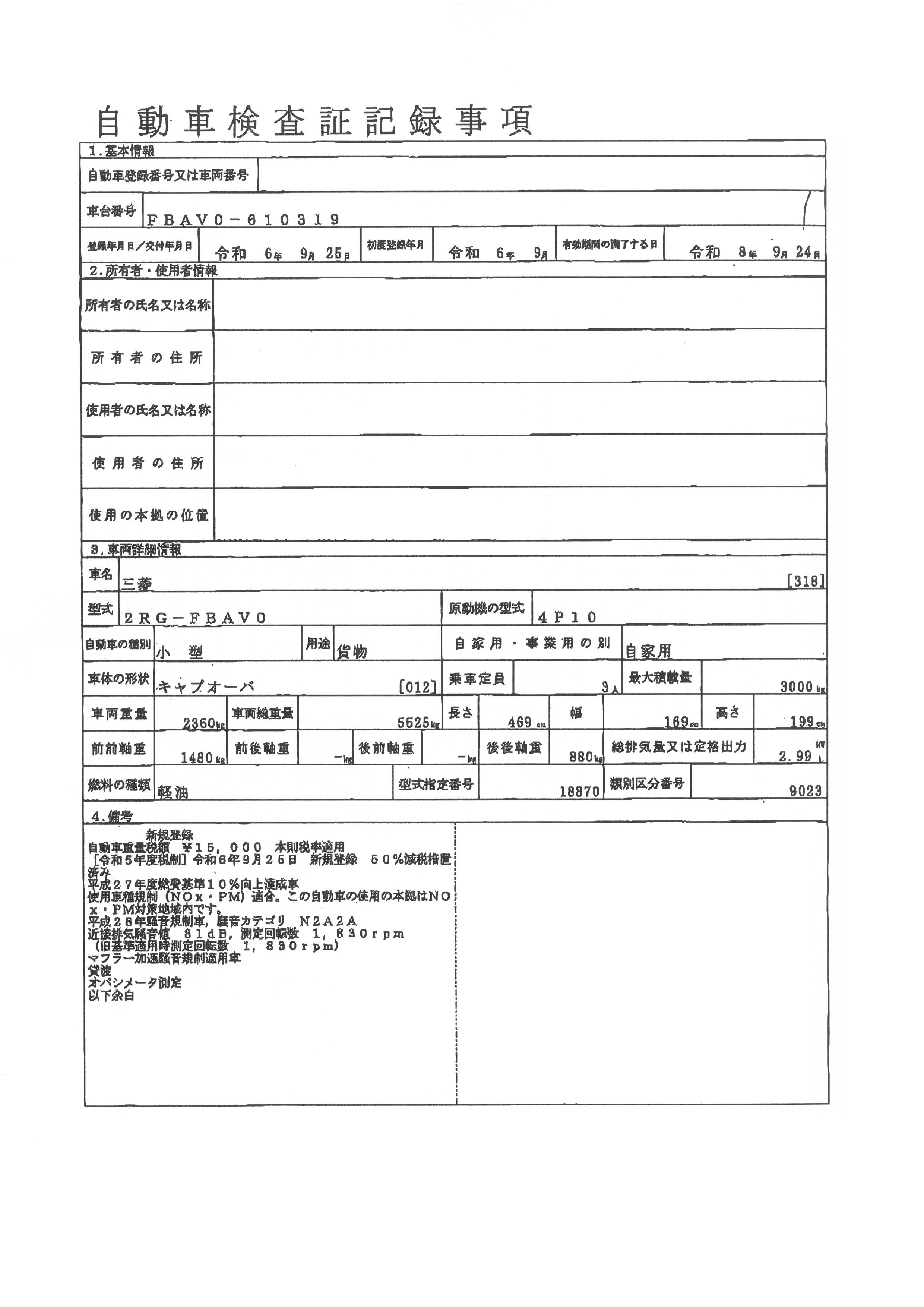 初年度登録 令和6年9月 型式 2RG-FBAV0 車検期限 令和8年9月24日