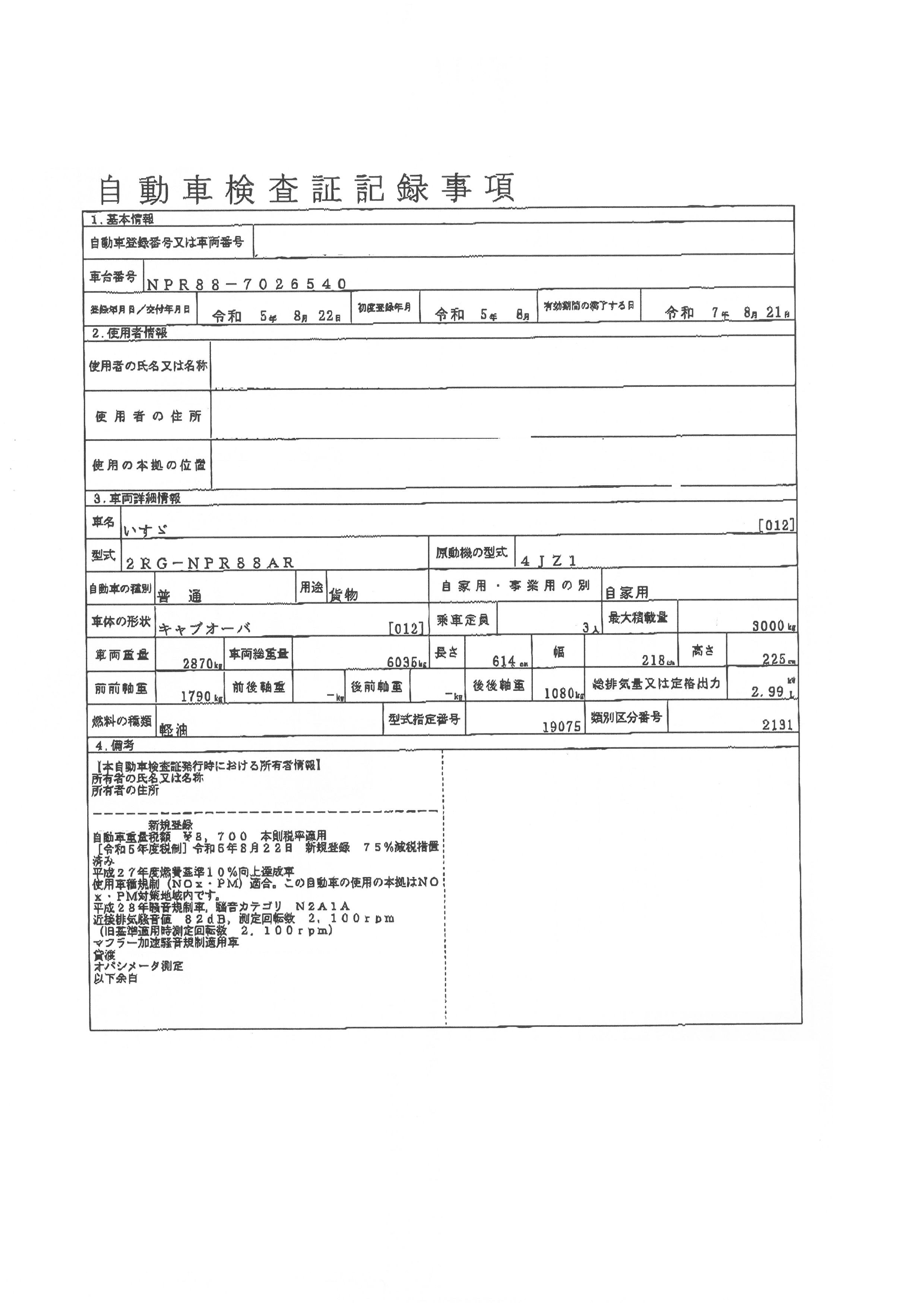 | 初年度登録 | 令和5年8月 | 型式 | 2RG-NPR88AR | 車検期限 | 令和7年8月21日 |