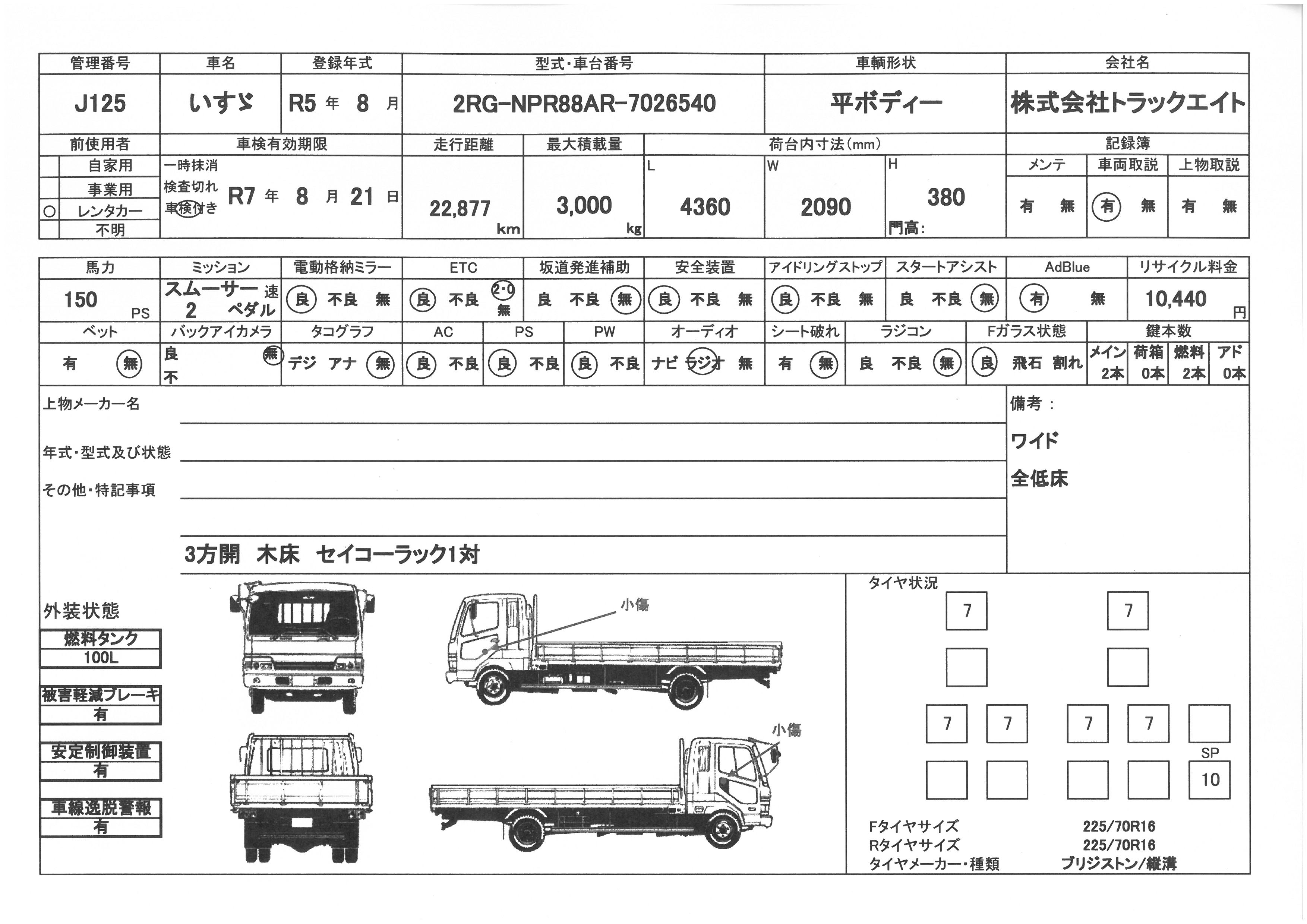 | 走行距離 | 23千km | リサイクル料 | 10440円 | 積載量 | 3000㎏ |