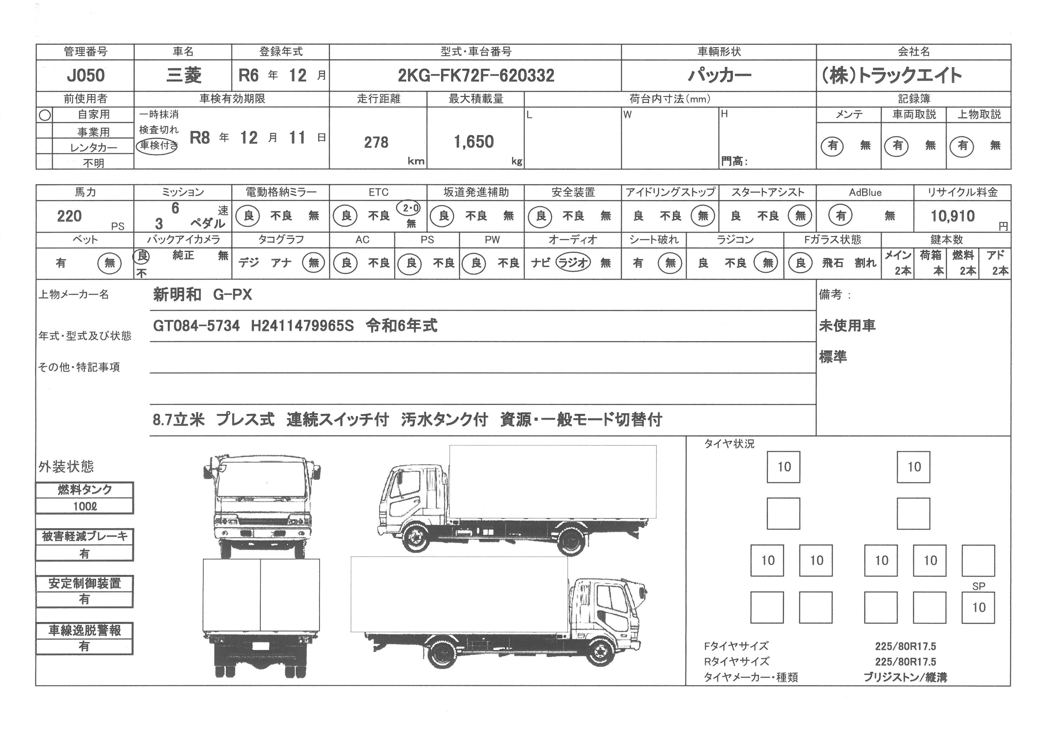 セールスポイント 未使用車 新明和G-PX 8.7立米 プレス式 連続スイッチ付 汚水タンク付