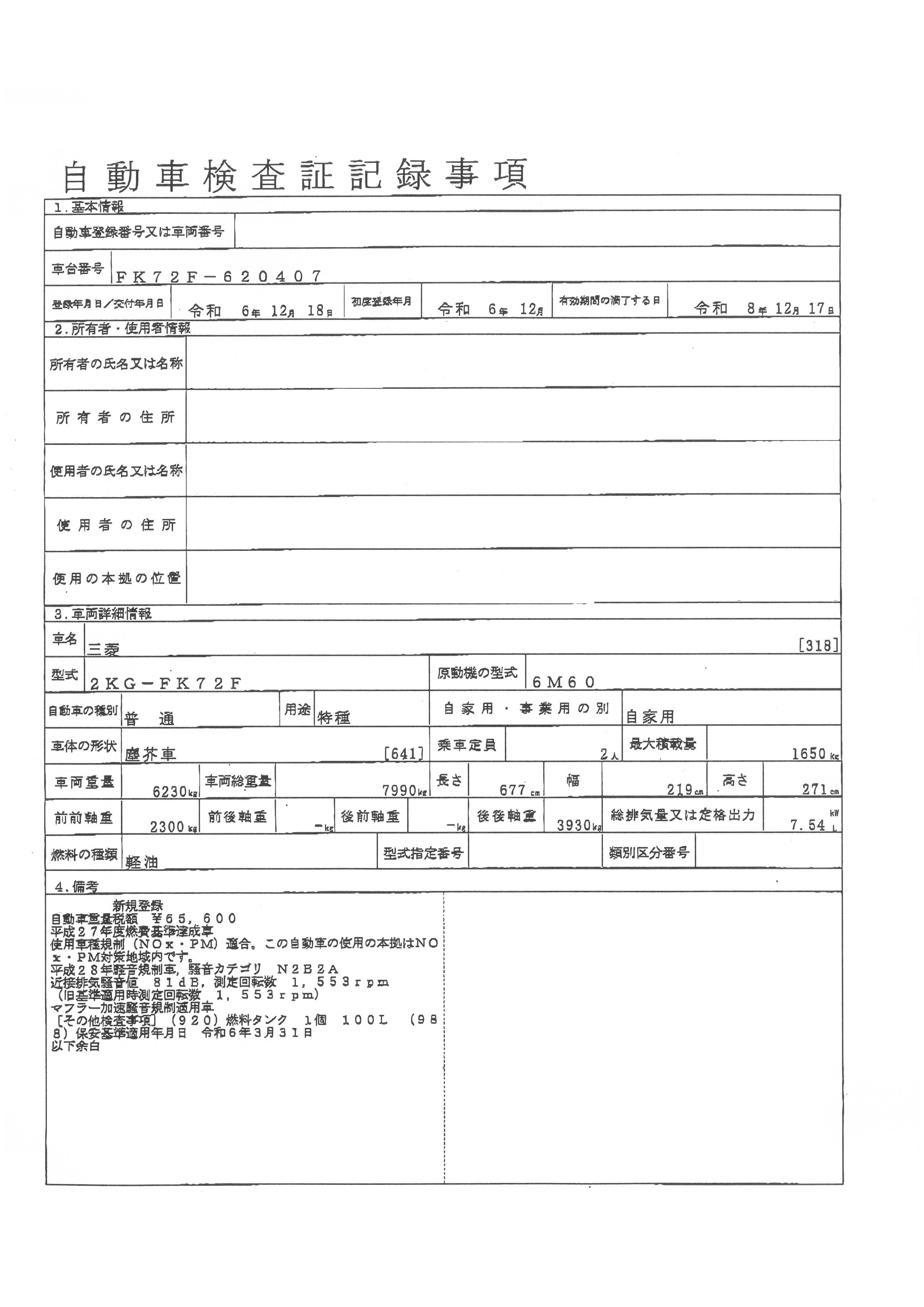 | 初年度登録 | 令和6年12月 | 型式 | 2KG-FK72F | 車検期限 | 令和8年12月17日 |
