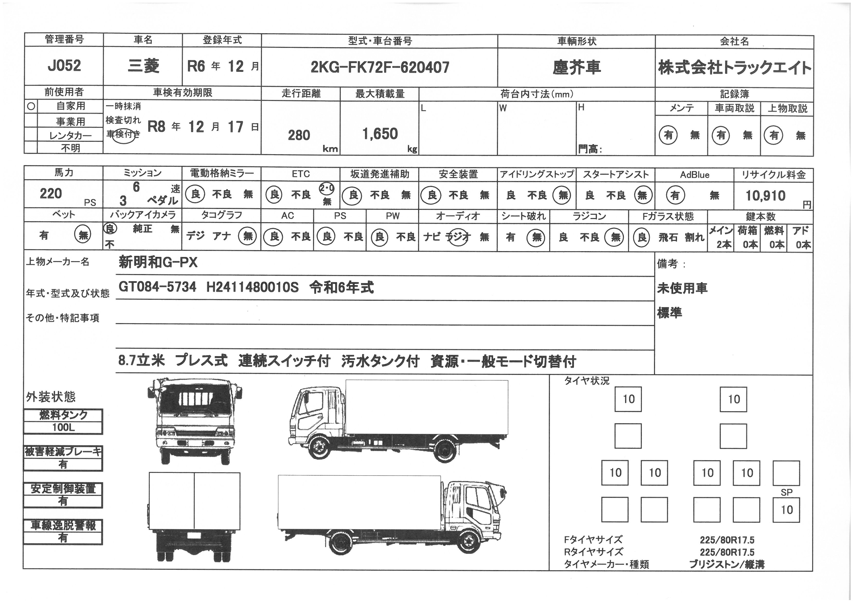 | ボディー仕様 | 新明和G-PX 8.7立米 プレス式 連続スイッチ付 汚水タンク付 資源・一般モード切替スイッチ付 | ||||