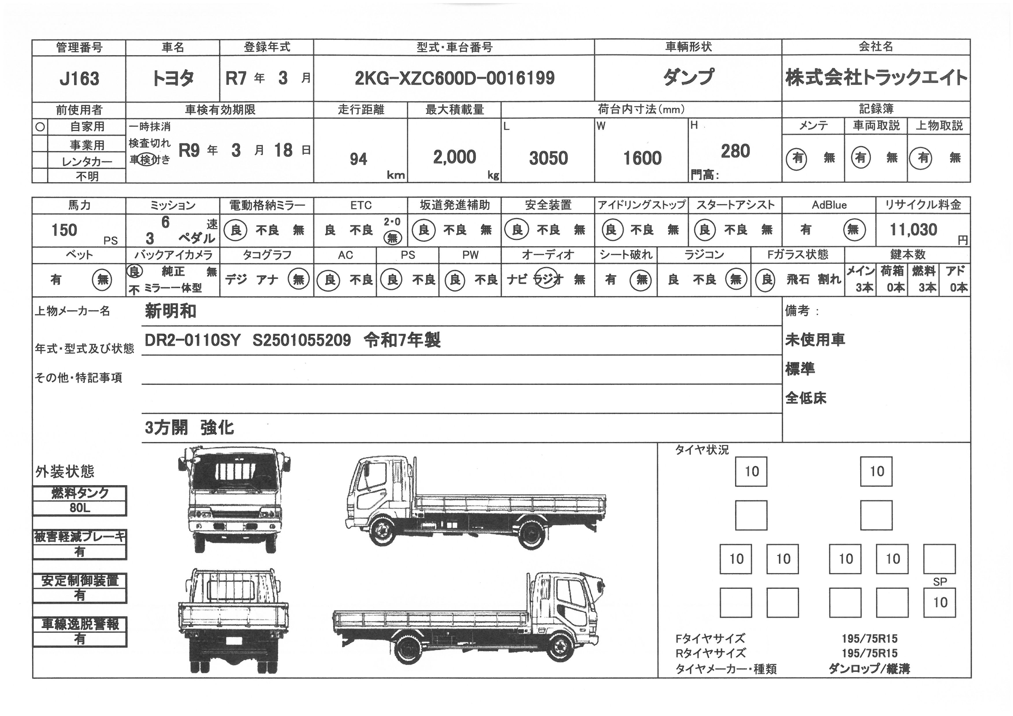 トヨタ 令和7年式 ダンプ 新明和 全低床 2t積載 トラック情報 ダンプ車・ミキサー車J163 by 鈴木英治. 売約済み 車両情報 問合せ番号 J163 [八千代在庫] メーカー トヨタ 形状 ダンプ 初年度登録 令和7年3月 型式 2KG-XZC600D 車検期限 令和9年3月18日 走行距離 1千km リサイクル料 11030円 積載量 2000㎏ 馬力 150PS ミッション 6速 エンジン型式 N04C 上物 新明和 上物形式 DR2-0110SY 荷台寸法 3.05×1.60×0.28 ボディー仕様 3方開 強化 セールスポイント 未使用車 新明和 土砂ダンプ 全低床 2t積載 車検証 状態表