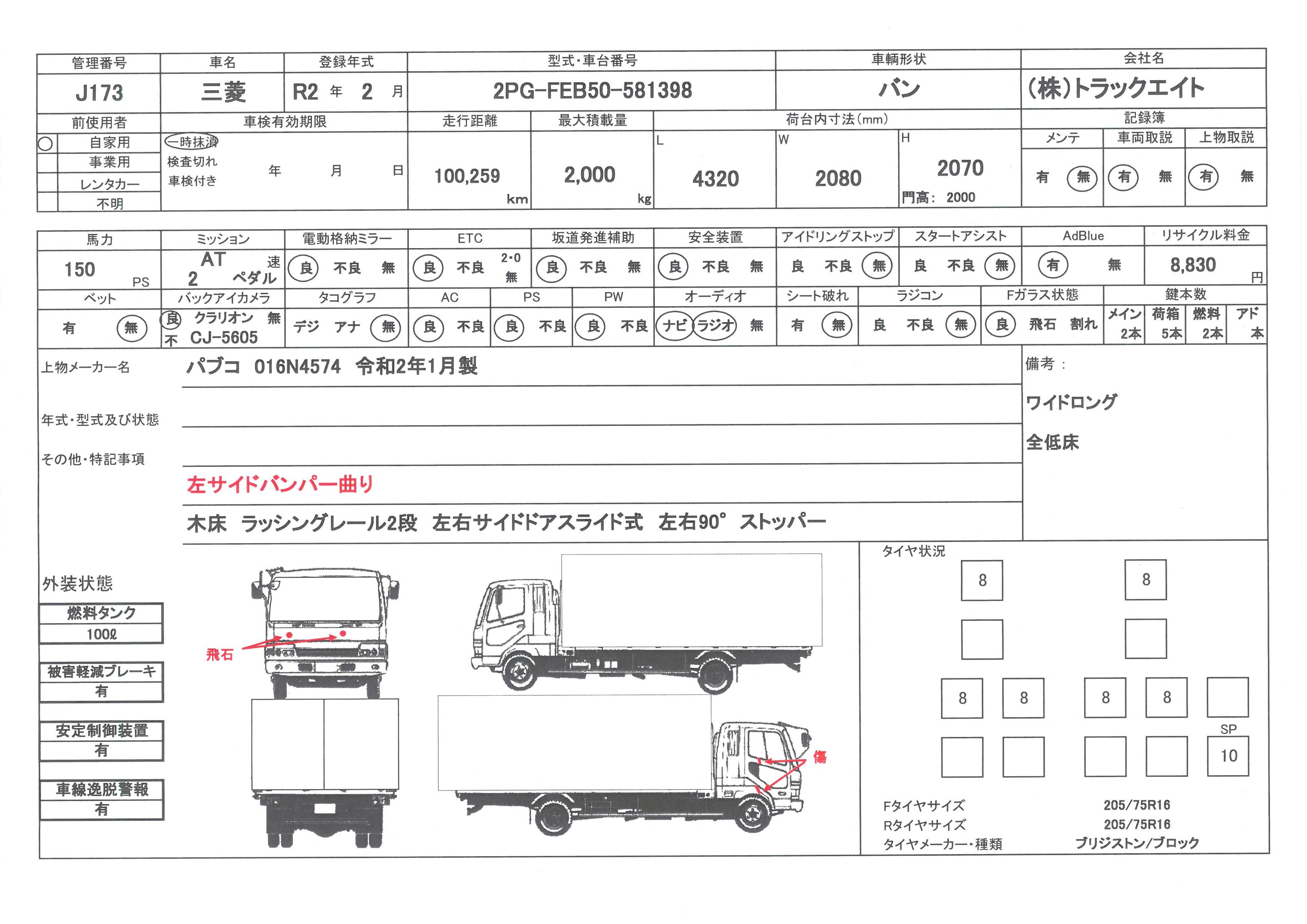 | 走行距離 | 100千km | リサイクル料 | 8830円 | 積載量 | 2000㎏ |
