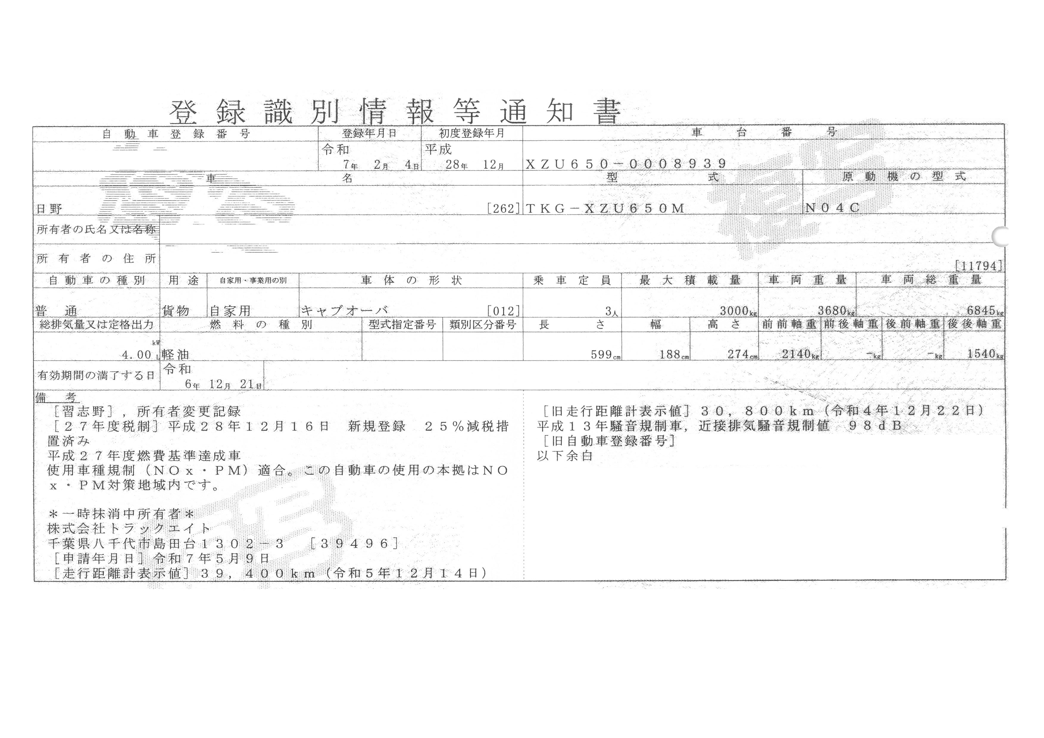 初年度登録 平成28年10月 型式 TKG-XZU650M 車検期限 一時抹消