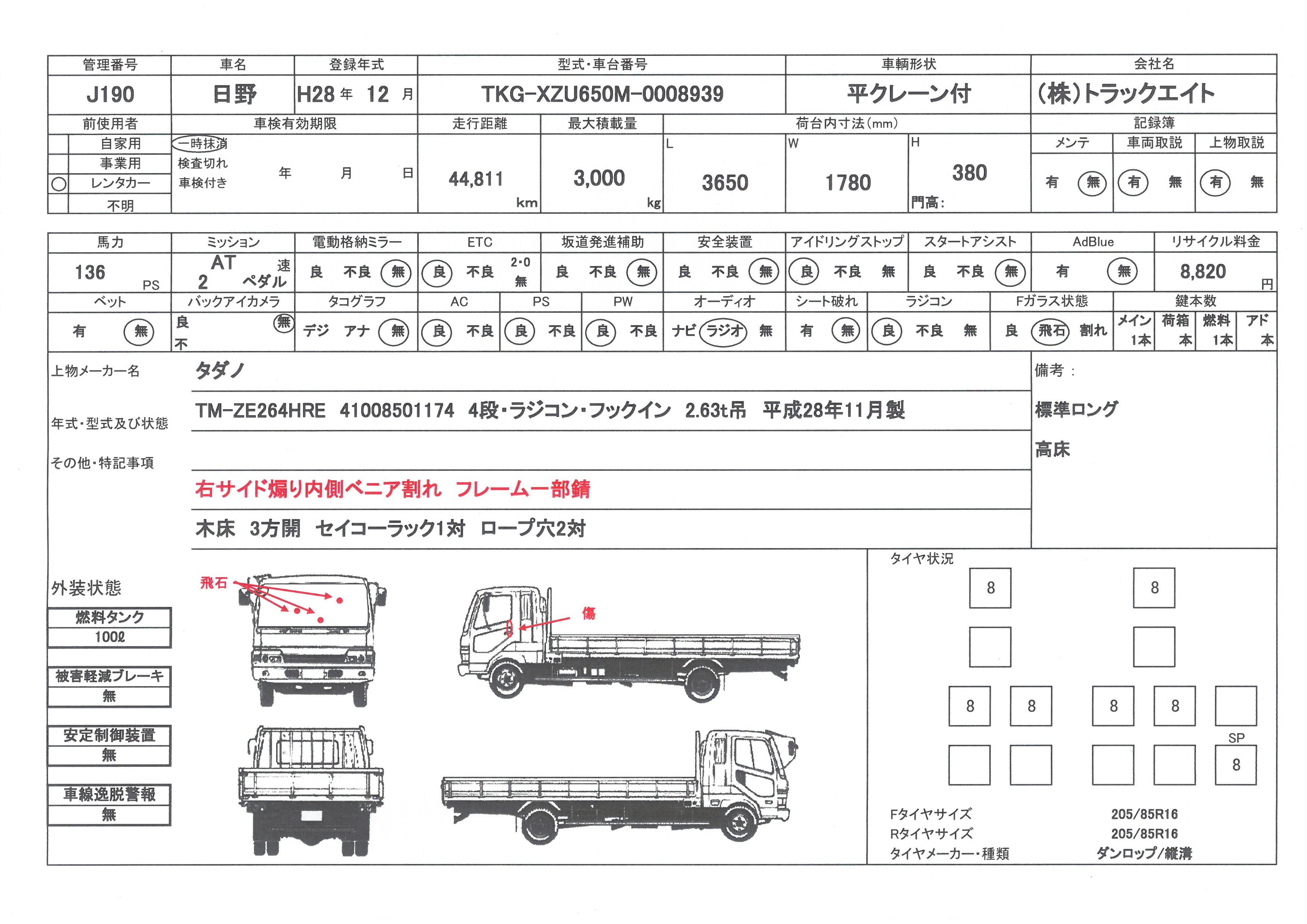 問合せ番号 J190 [船橋在庫] メーカー 日野 形状 平クレーン付
