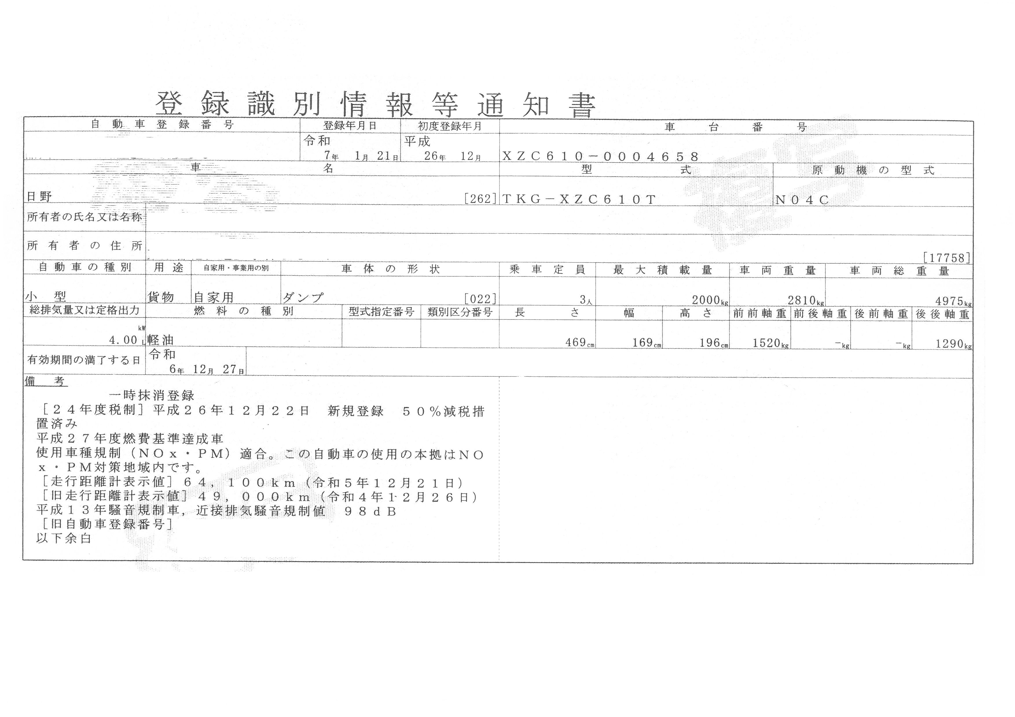 | 初年度登録 | 平成26年12月 | 型式 | TKG-XZC610T | 車検期限 | 一時抹消 |