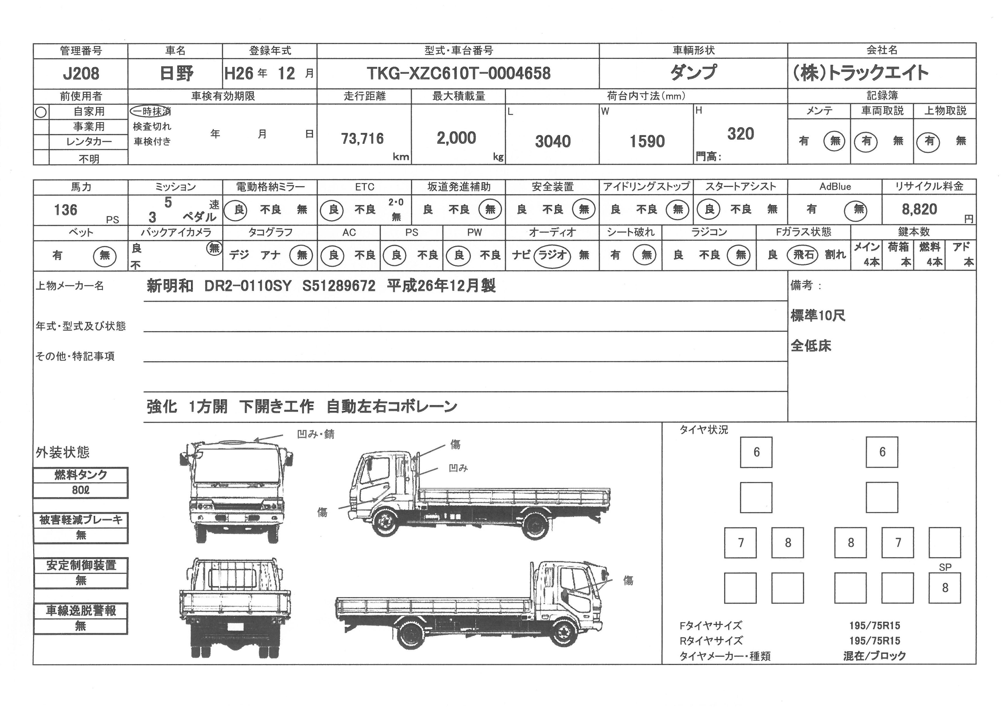 | 問合せ番号 | J208 [船橋在庫] | メーカー | 日野 | 形状 | ダンプ |