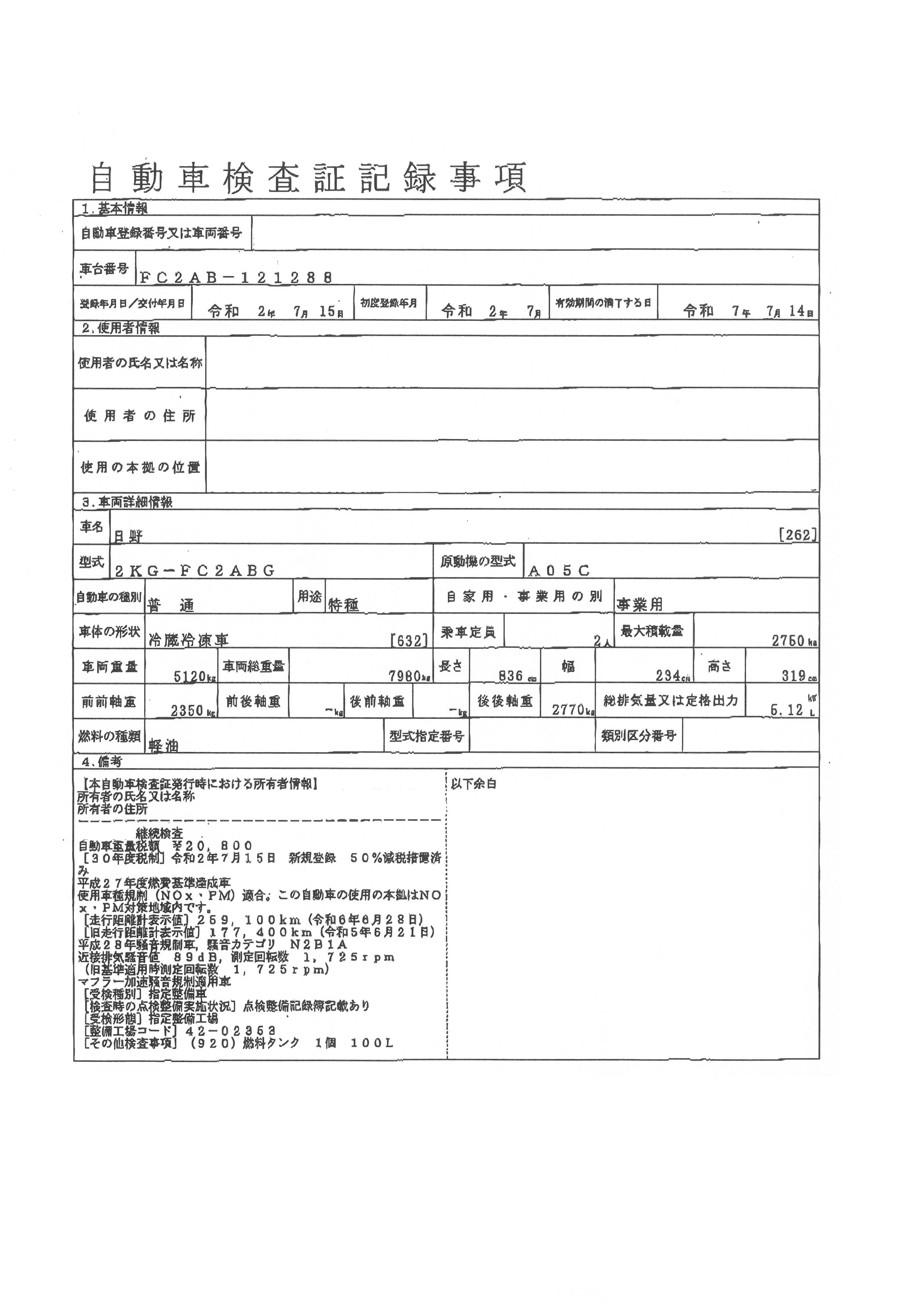 | 初年度登録 | 令和2年7月 | 型式 | 2KG-FC2ABG | 車検期限 | 令和7年7月14日 |