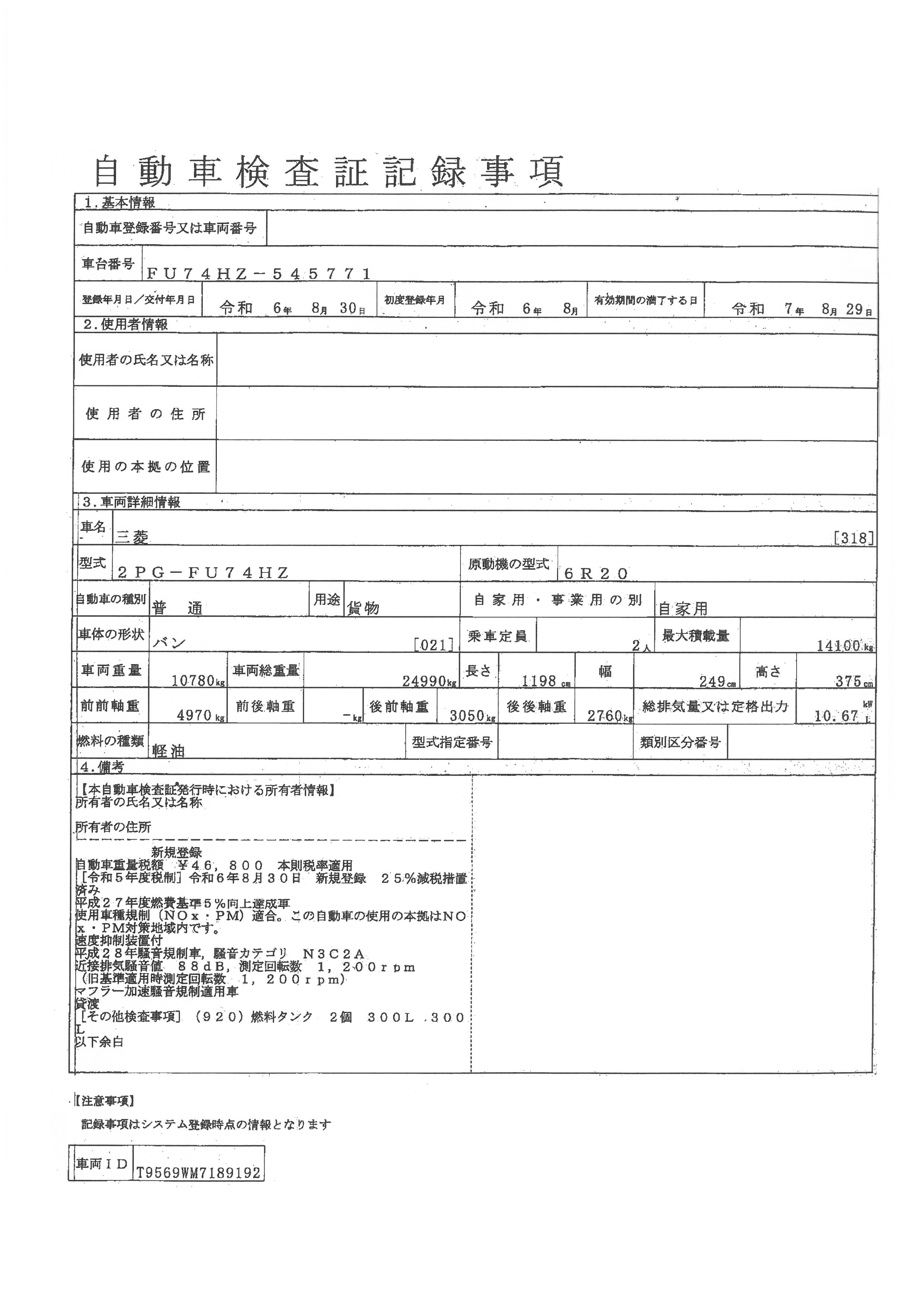 | 初年度登録 | 令和6年8月 | 型式 | 2PG-FU74HZ | 車検期限 | 令和7年8月29日 |
