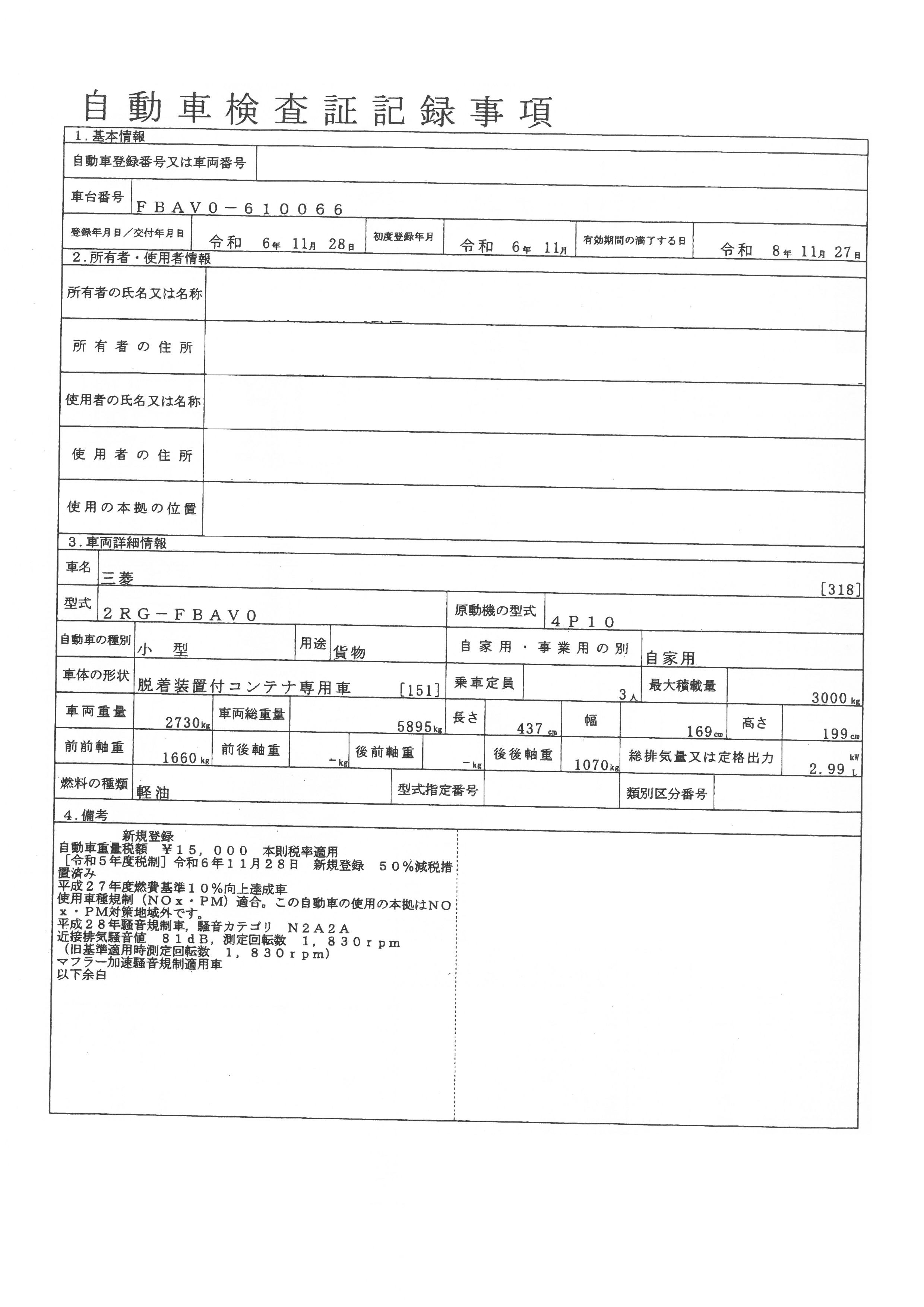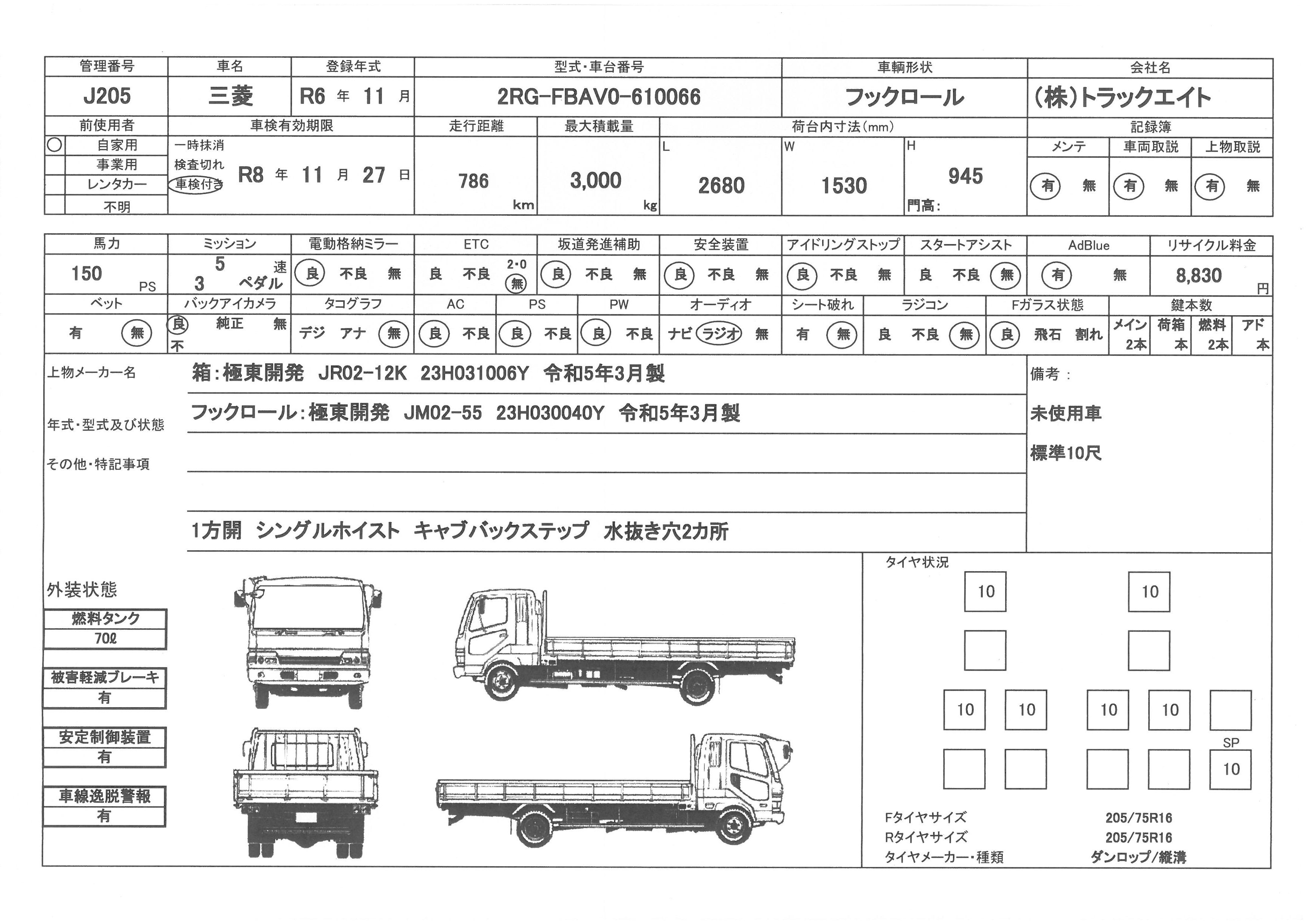 | 走行距離 | 1千km | リサイクル料 | 8830円 | 積載量 | 3000㎏ |