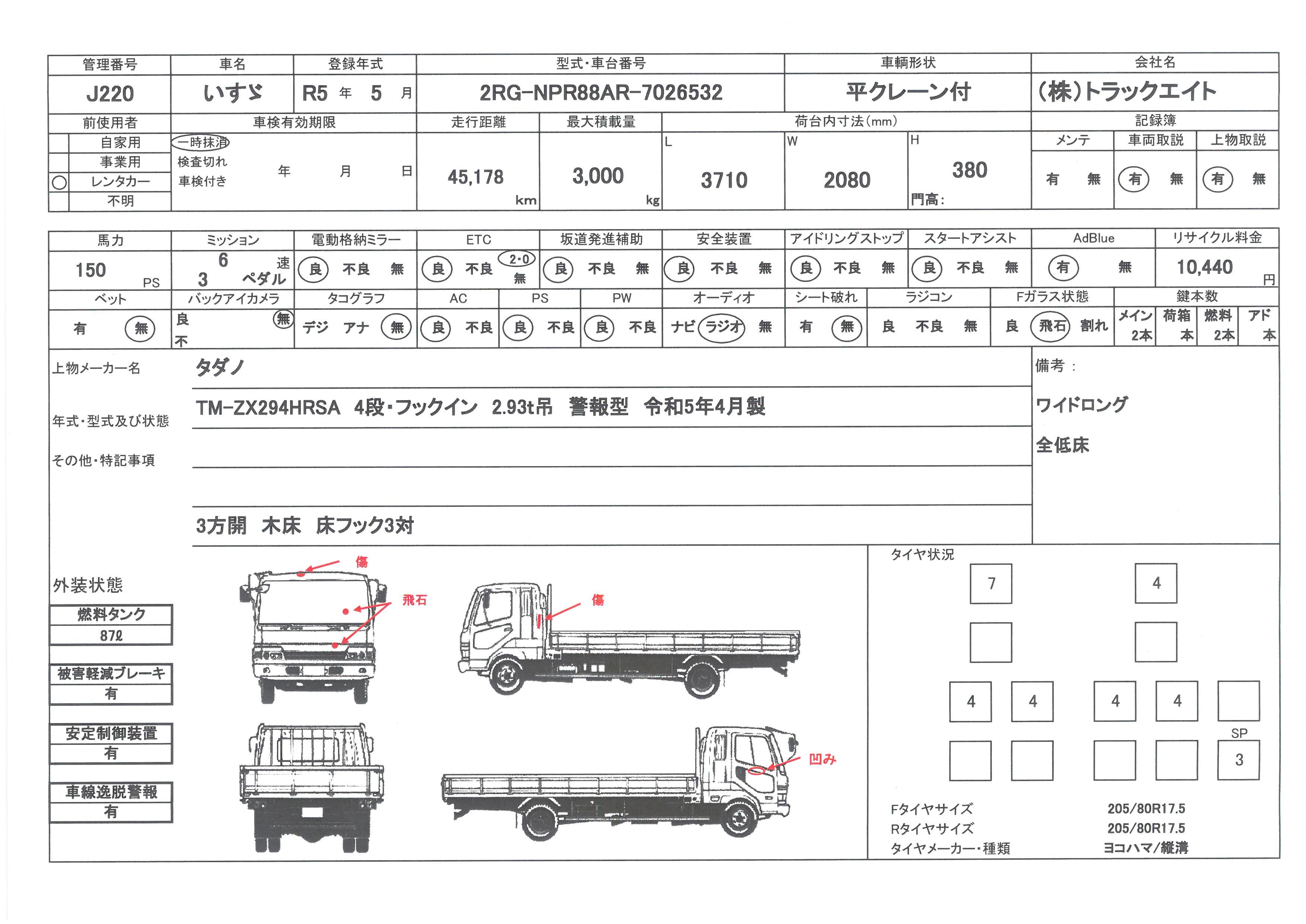 問合せ番号 J220 [船橋在庫] メーカー いすゞ 形状 平クレーン付