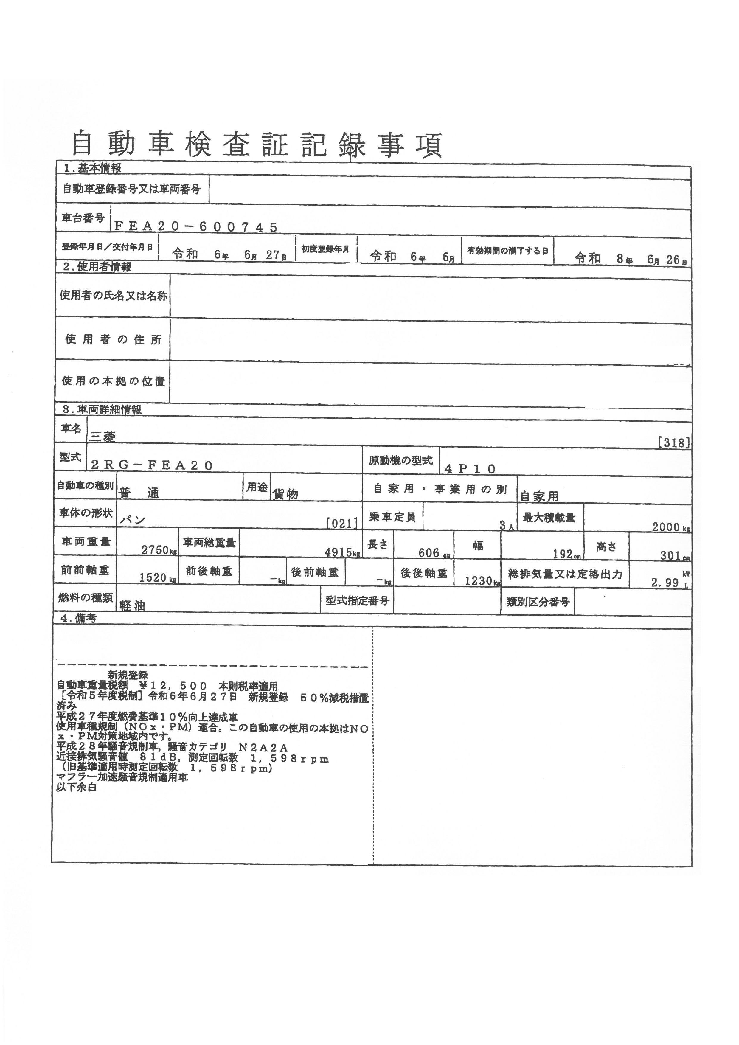 | 初年度登録 | 令和6年6月 | 型式 | 2RG-FEA20 | 車検期限 | 令和8年6月26日 |