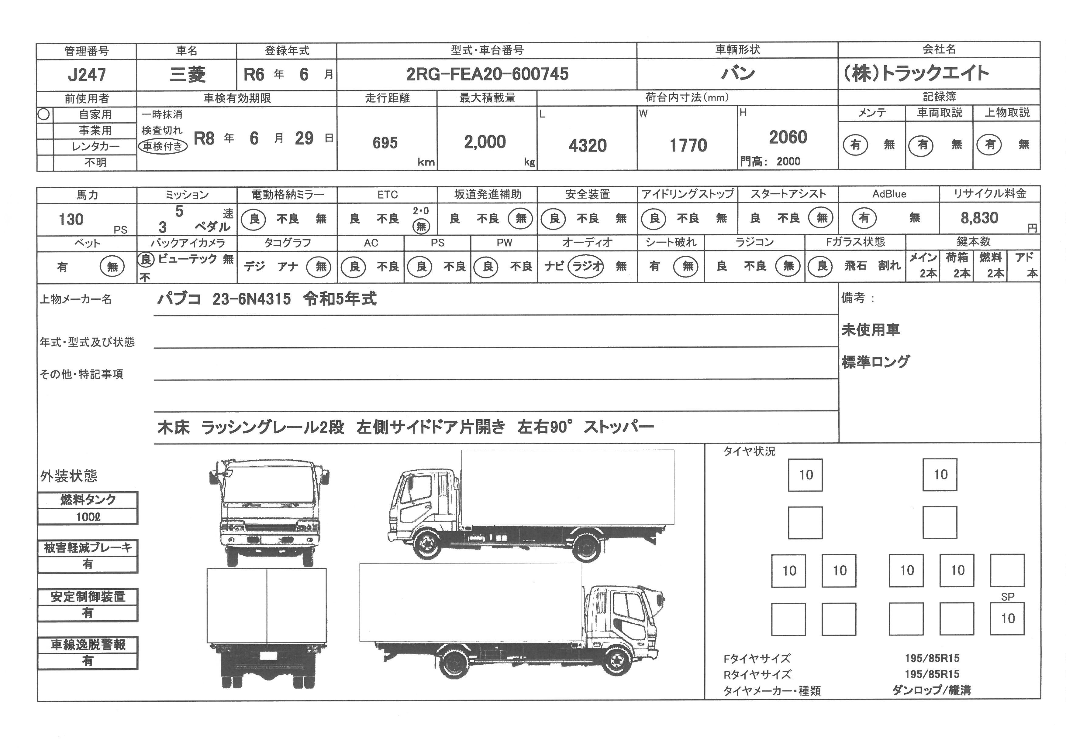 | 上物 | パブコ | 上物形式 | 23-6N4315 | 荷台寸法 | 4.32×1.77×2.06 |