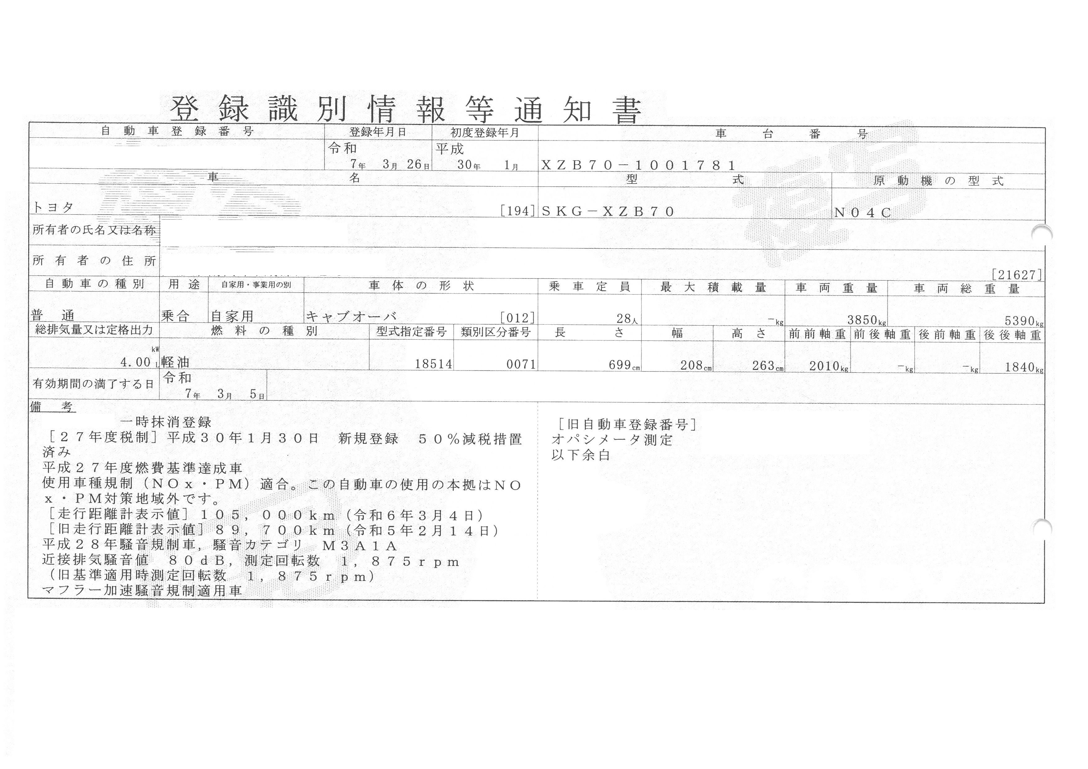 初年度登録 平成30年1月 型式 SKG-XZB70 車検期限 一時抹消