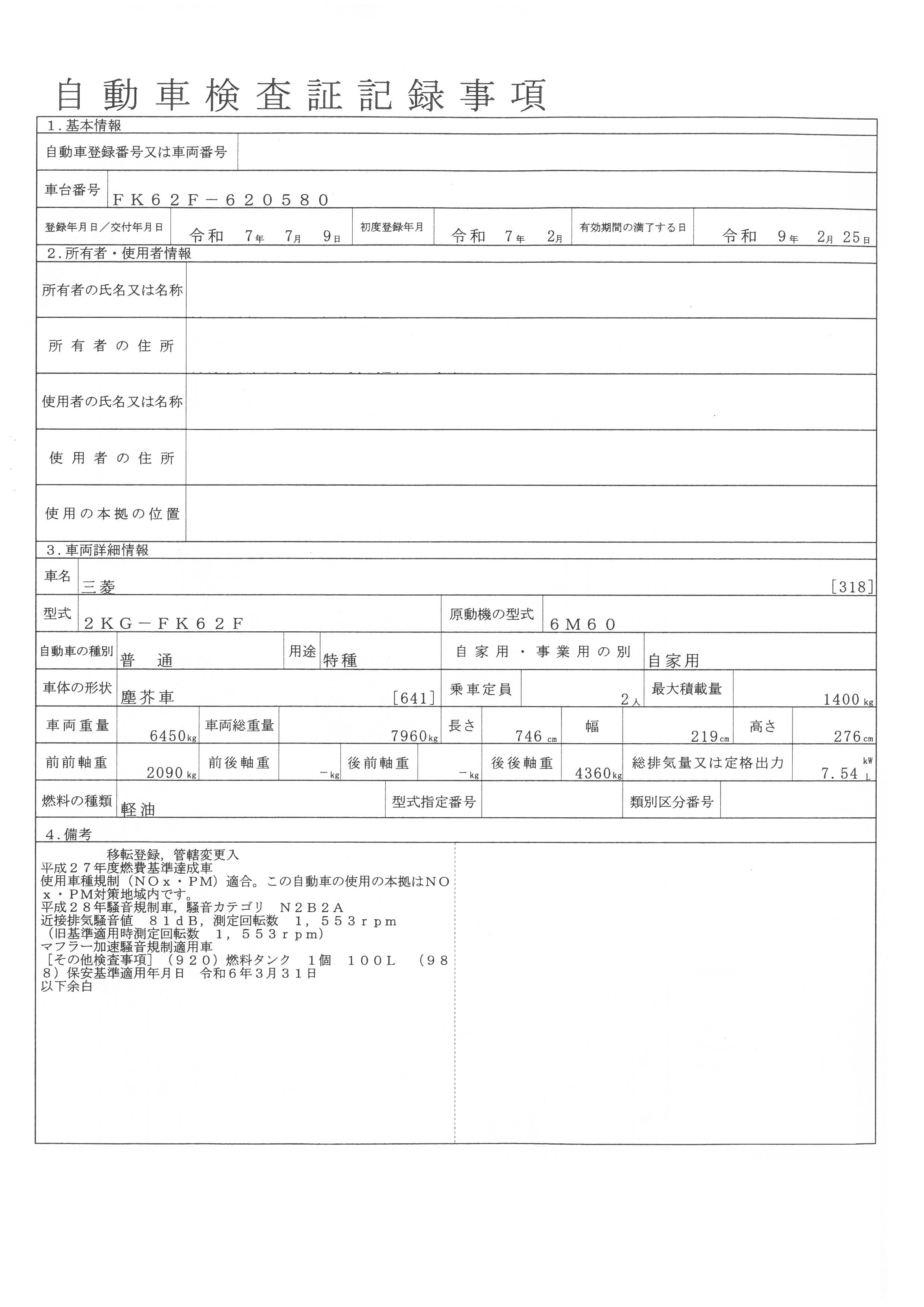 初年度登録 令和7年2月 型式 2KG-FK62F 車検期限 令和9年2月24日