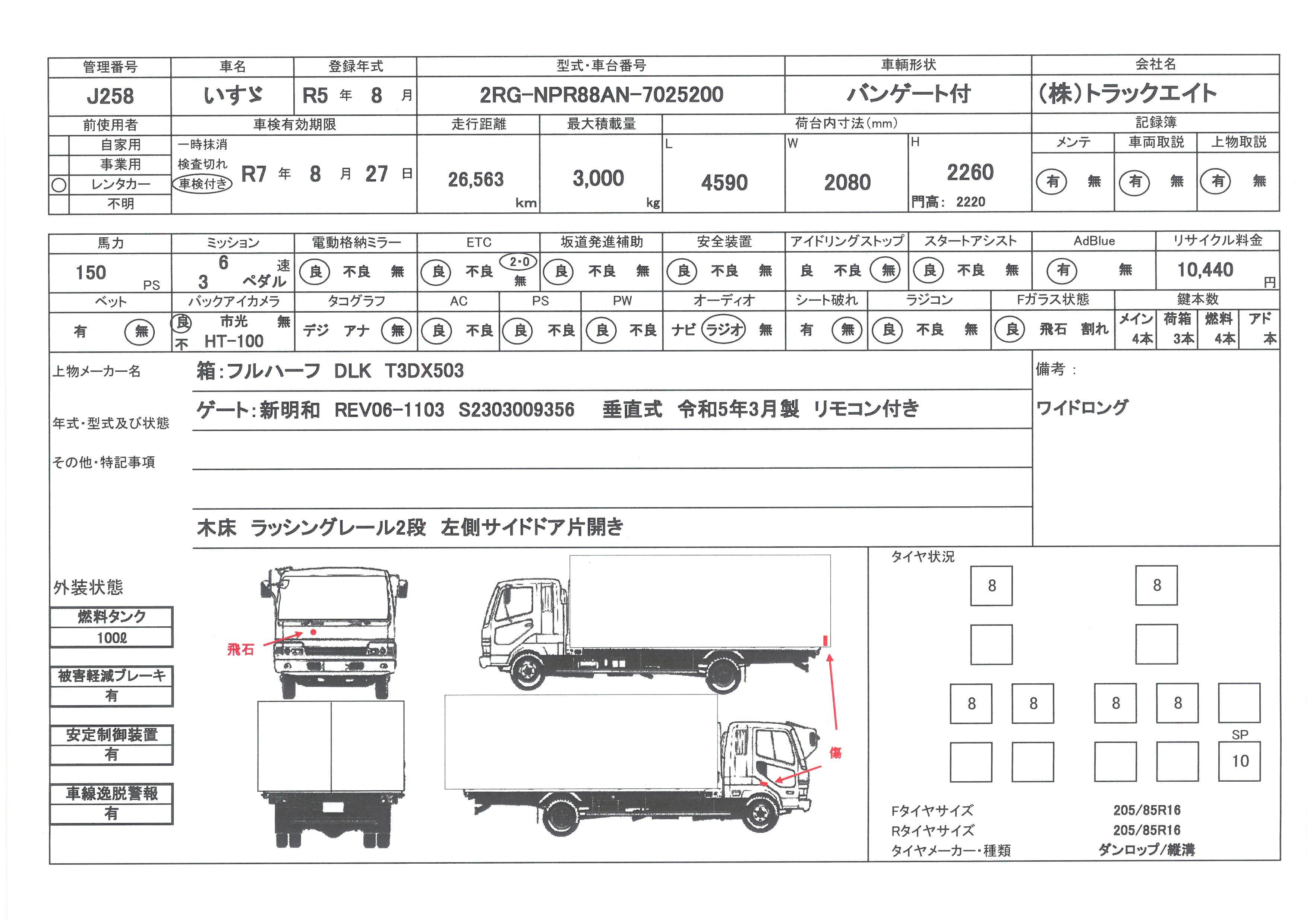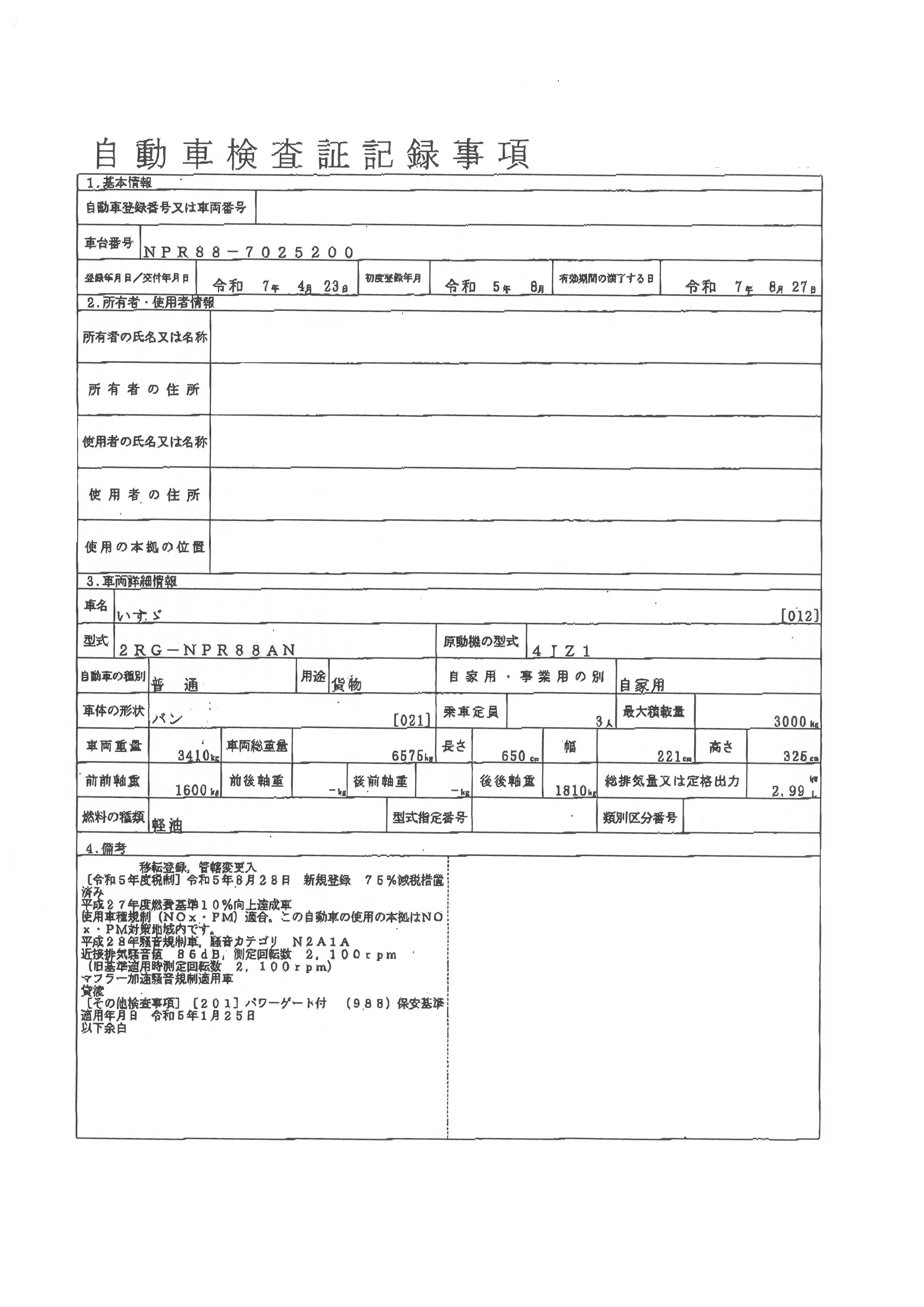 | 初年度登録 | 令和5年8月 | 型式 | 2RG-NPR88AN | 車検期限 | 令和7年8月27日 |