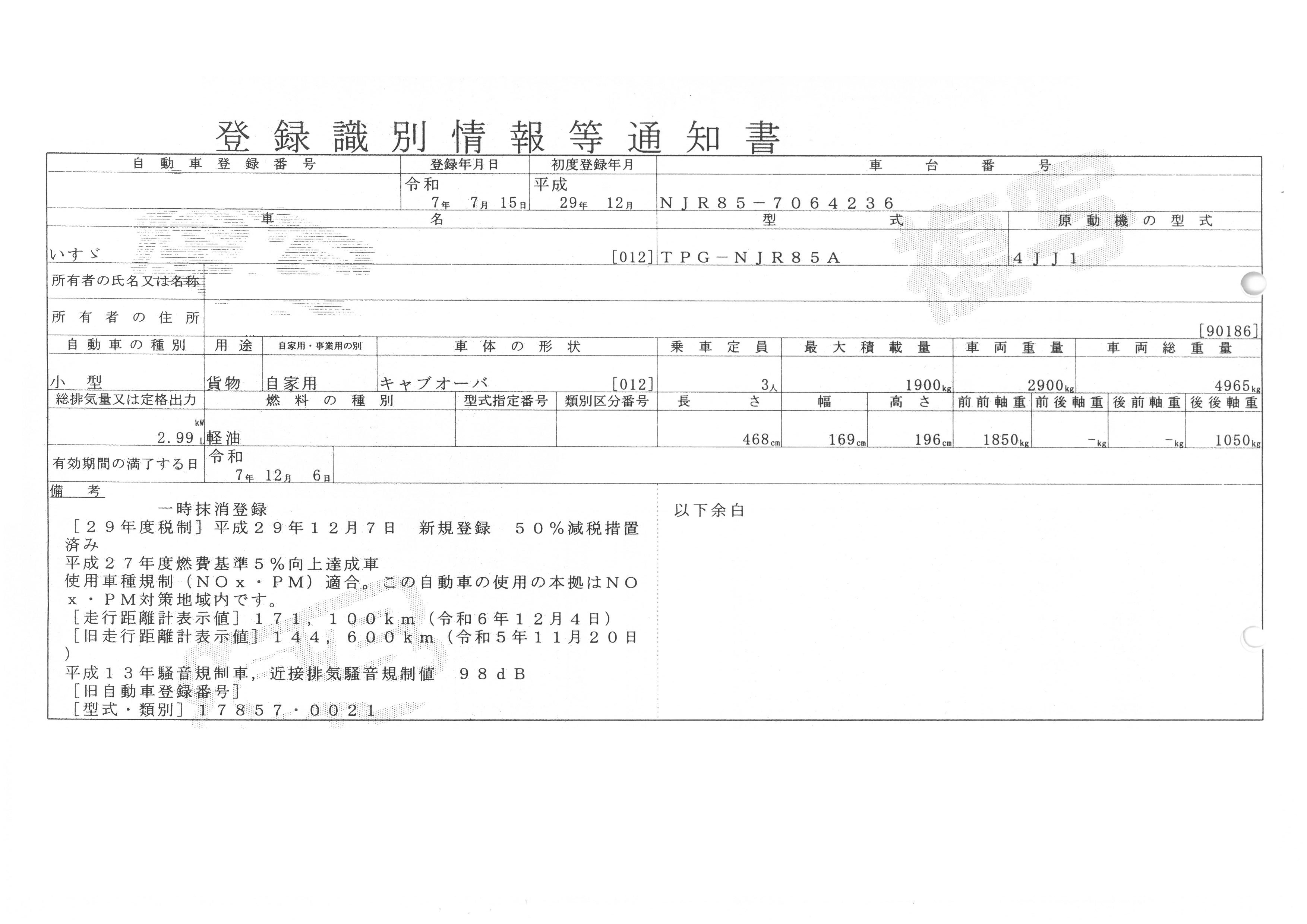 初年度登録 平成29年12月 型式 TPG-NJR85A 車検期限 一時抹消