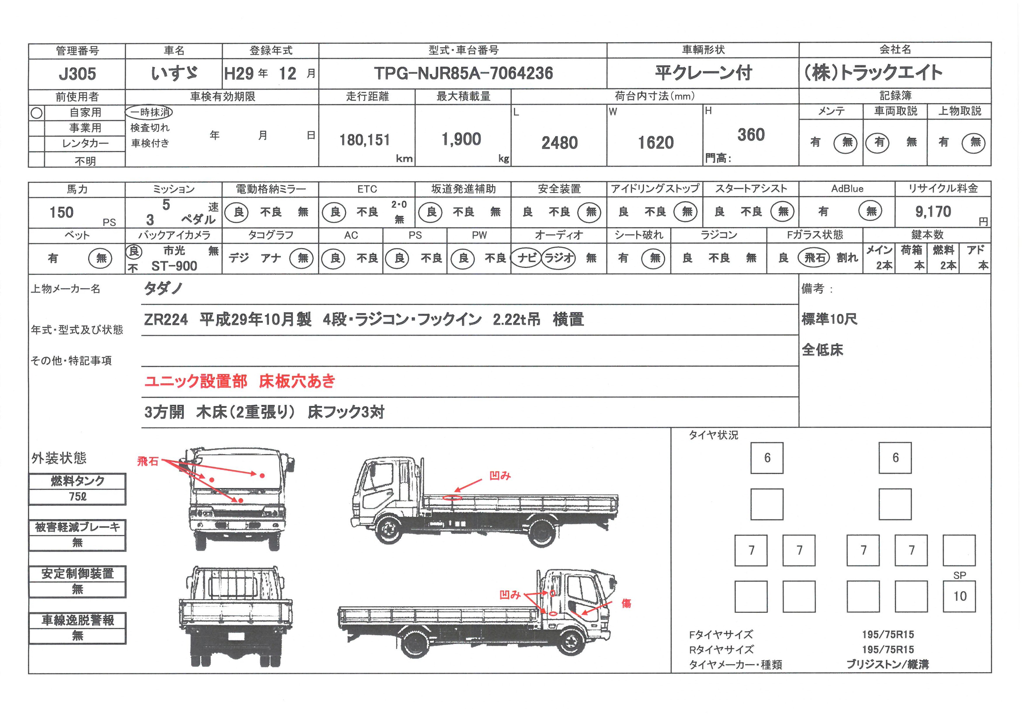 問合せ番号 J305 [船橋在庫] メーカー いすゞ 形状 平クレーン付