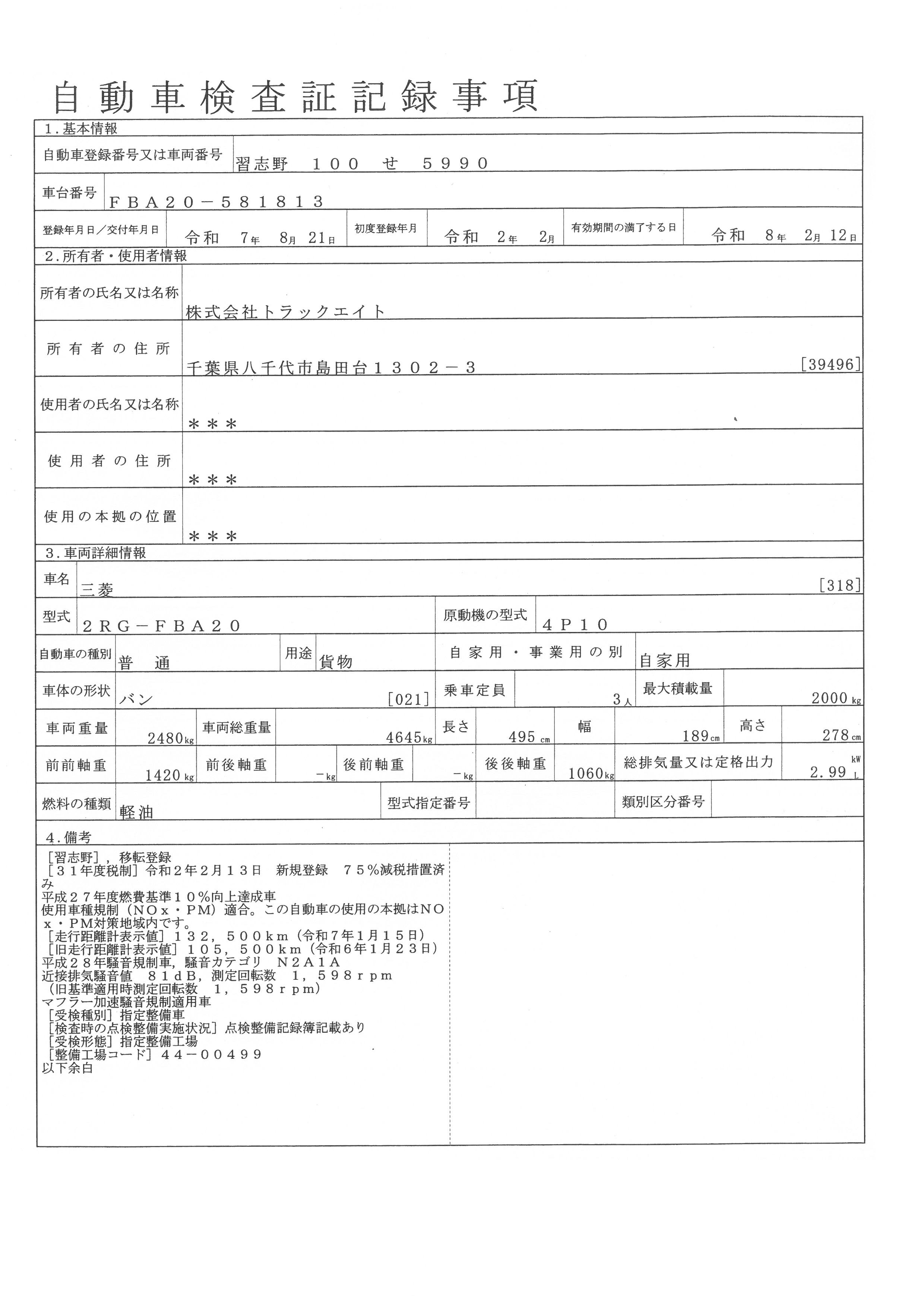 | 初年度登録 | 令和2年2月 | 型式 | 2RG-FBA20 | 車検期限 | 令和8年2月12日 |