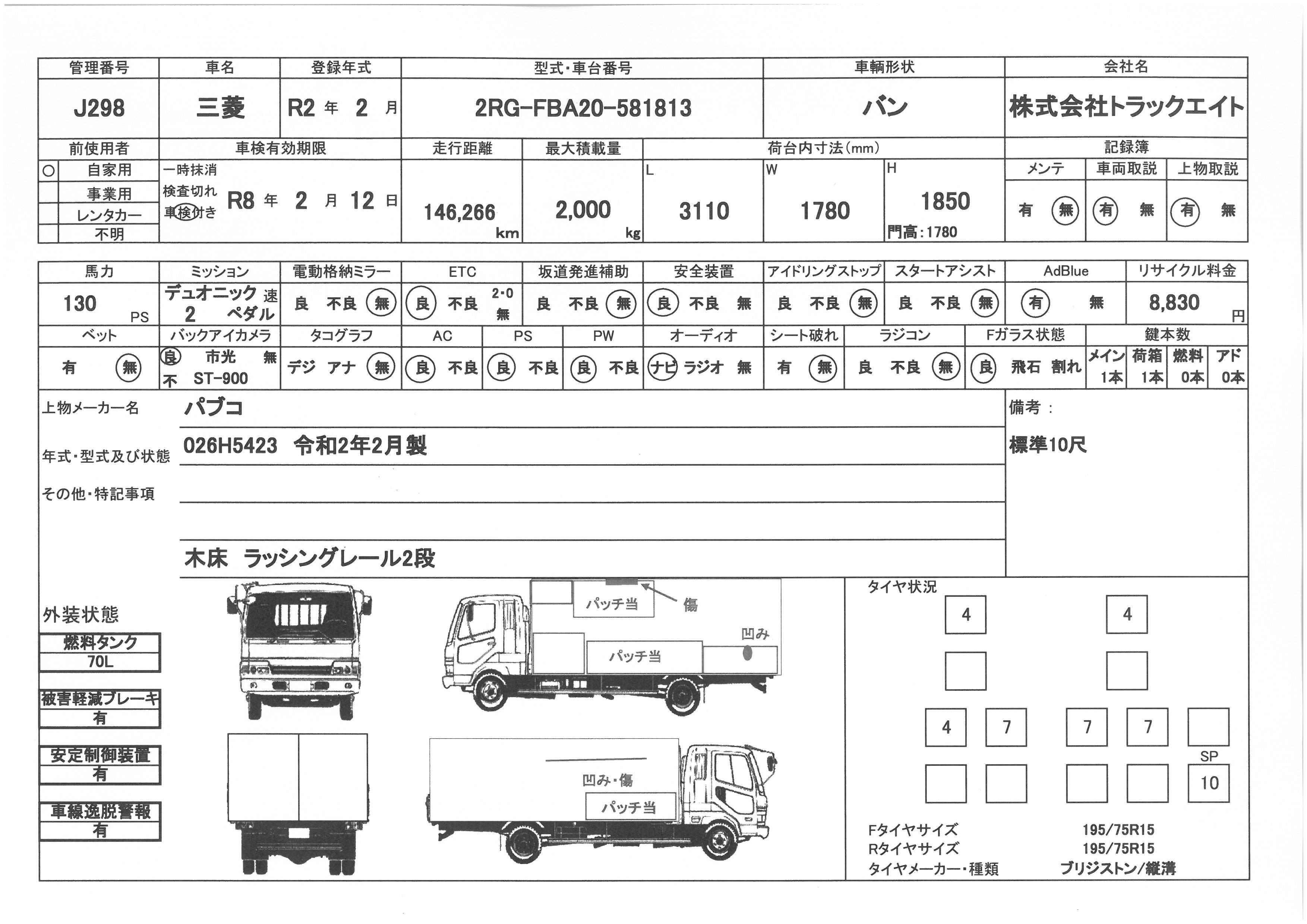 | 走行距離 | 146千km | リサイクル料 | 8830円 | 積載量 | 2000㎏ |