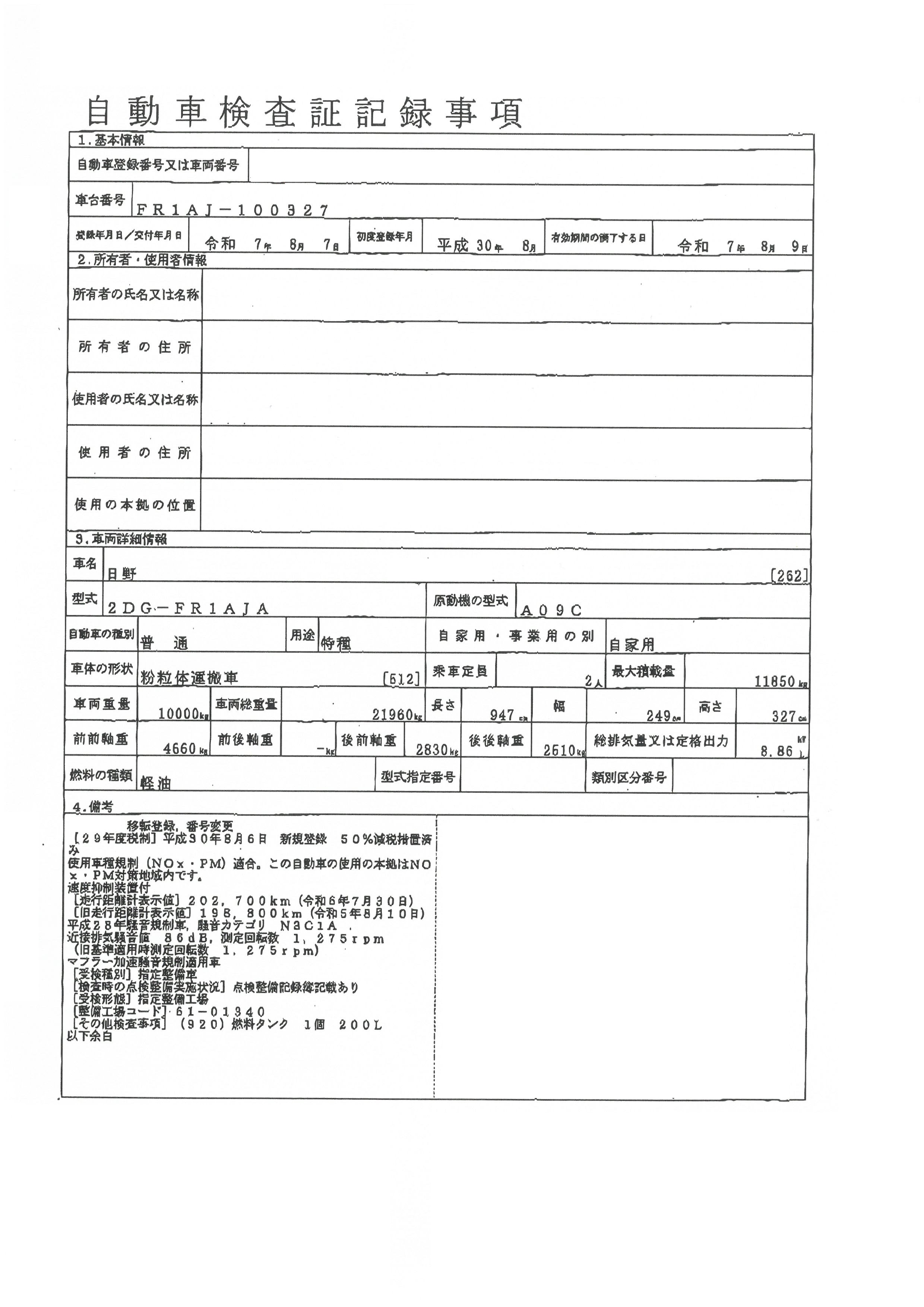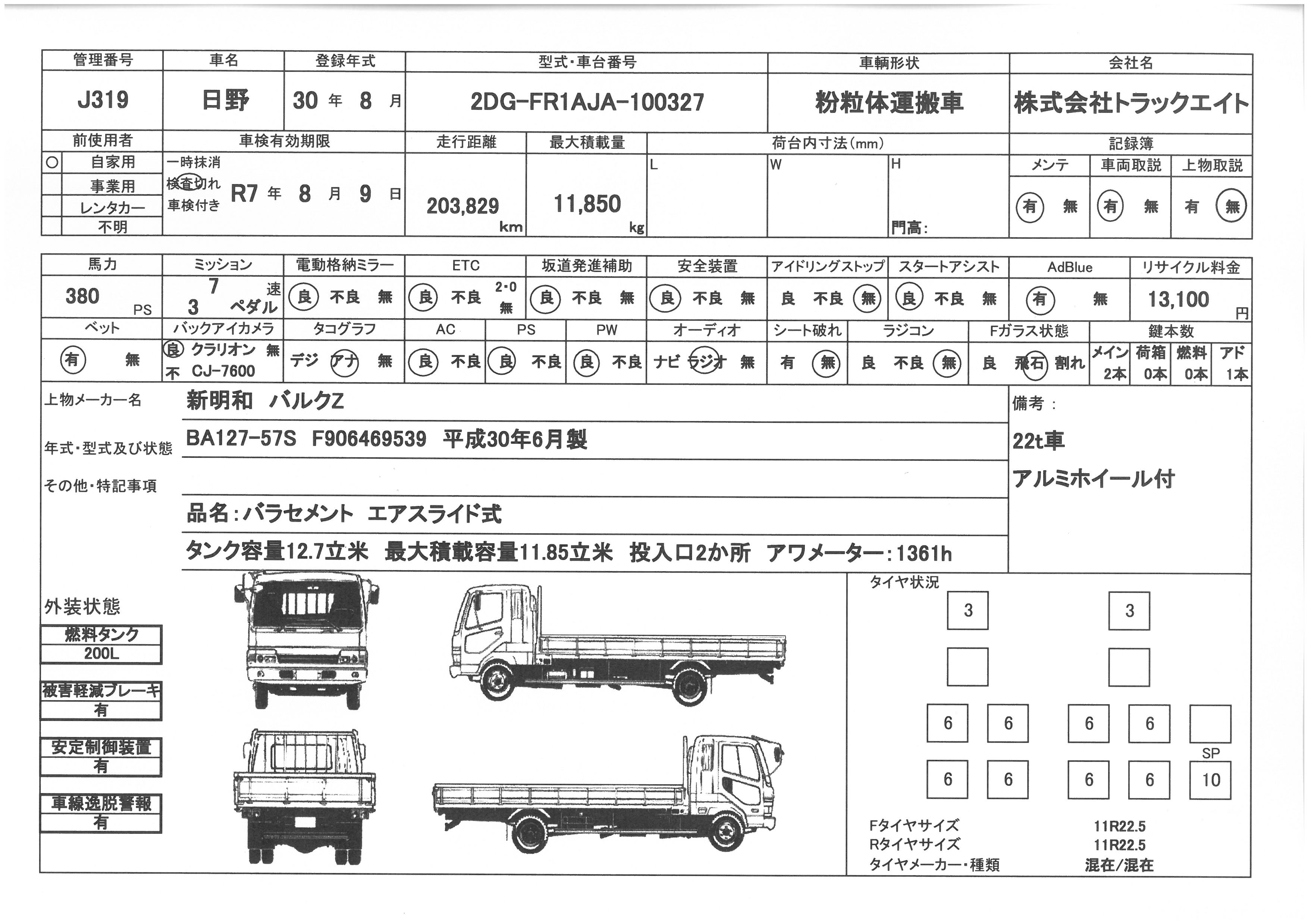| 走行距離 | 204千km | リサイクル料 | 13100円 | 積載量 | 11850㎏ |