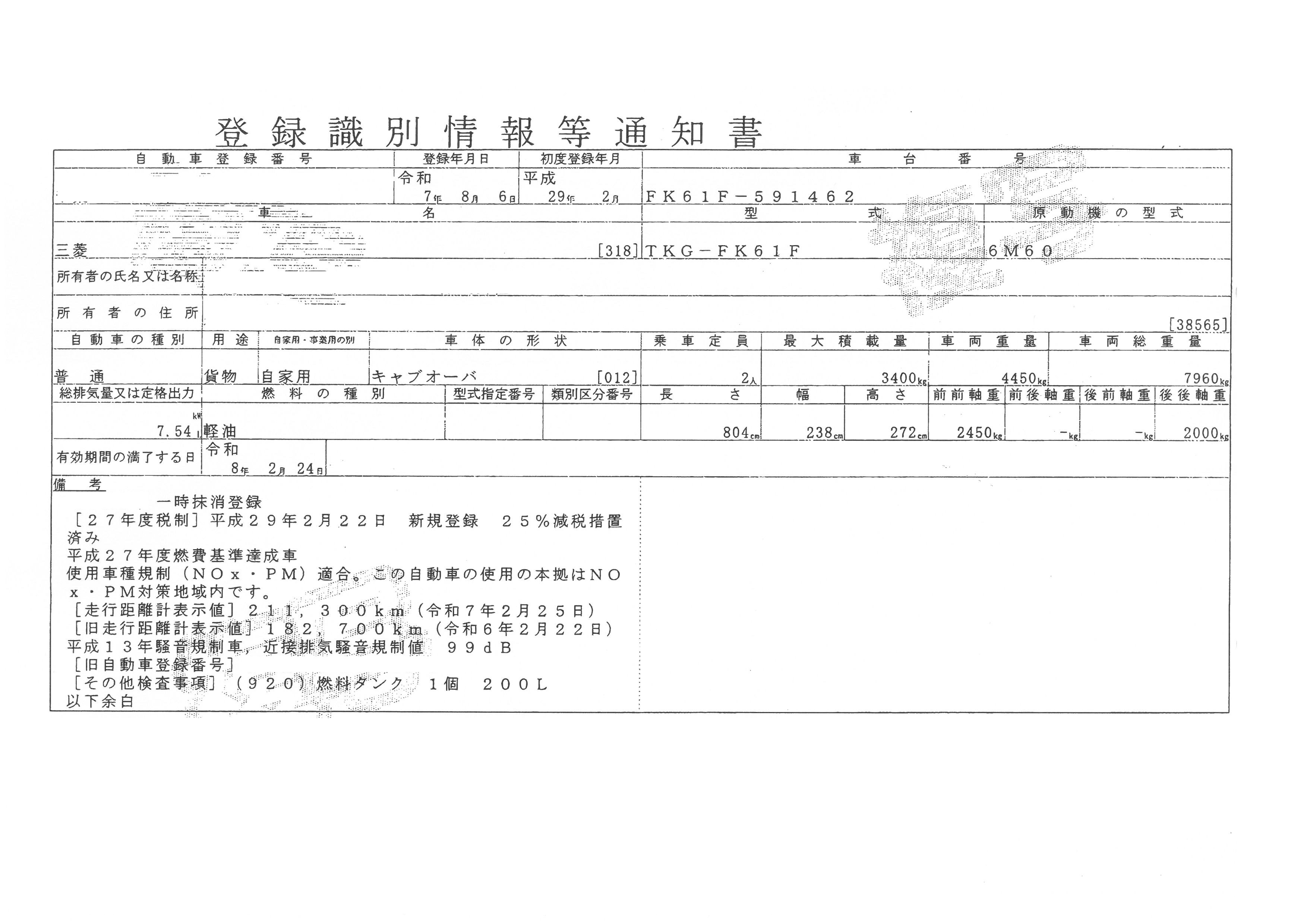 | 初年度登録 | 平成29年2月 | 型式 | TKG-FK61F | 車検期限 | 一時抹消 |