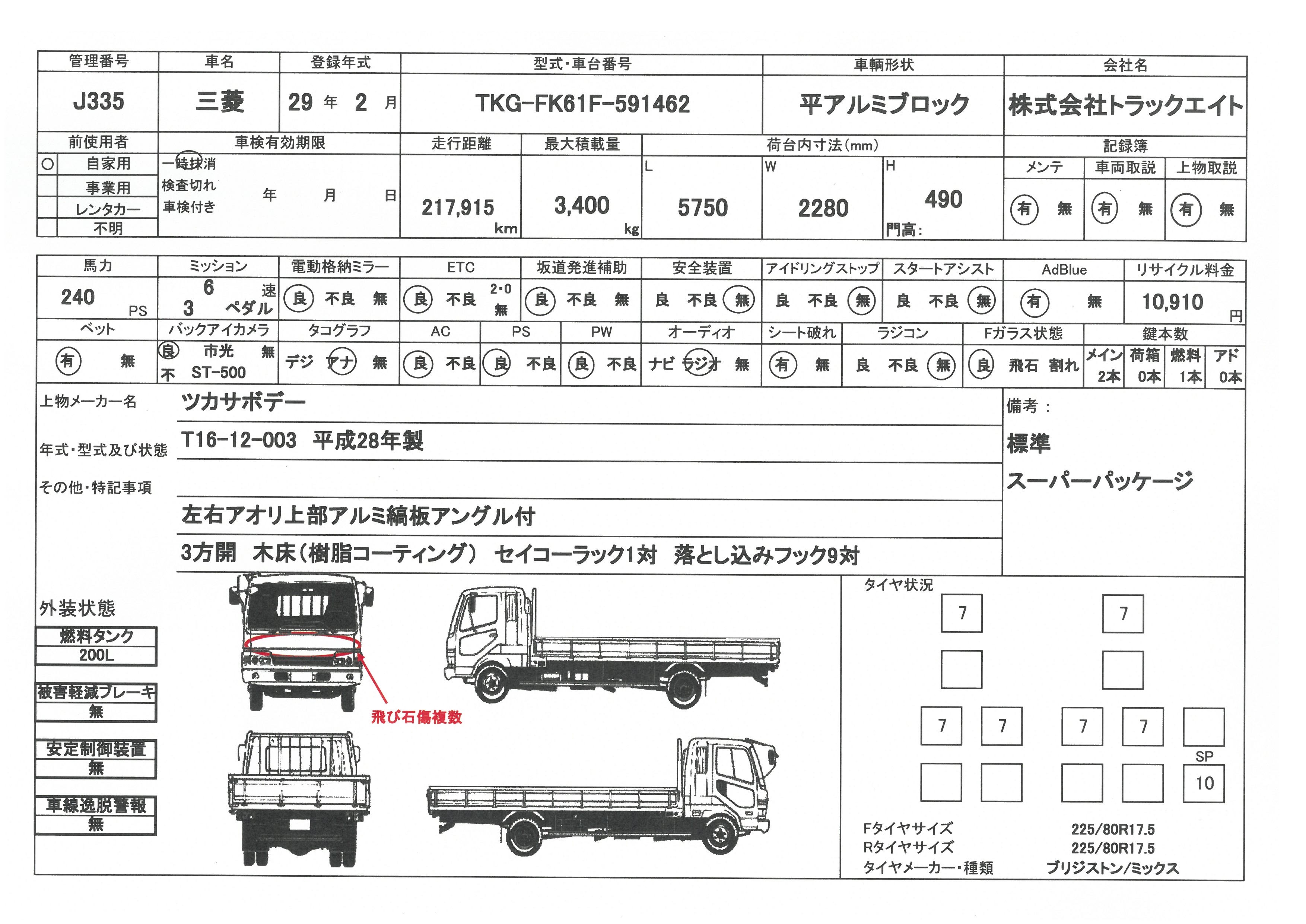 | 走行距離 | 218千km | リサイクル料 | 10910円 | 積載量 | 3400㎏ |