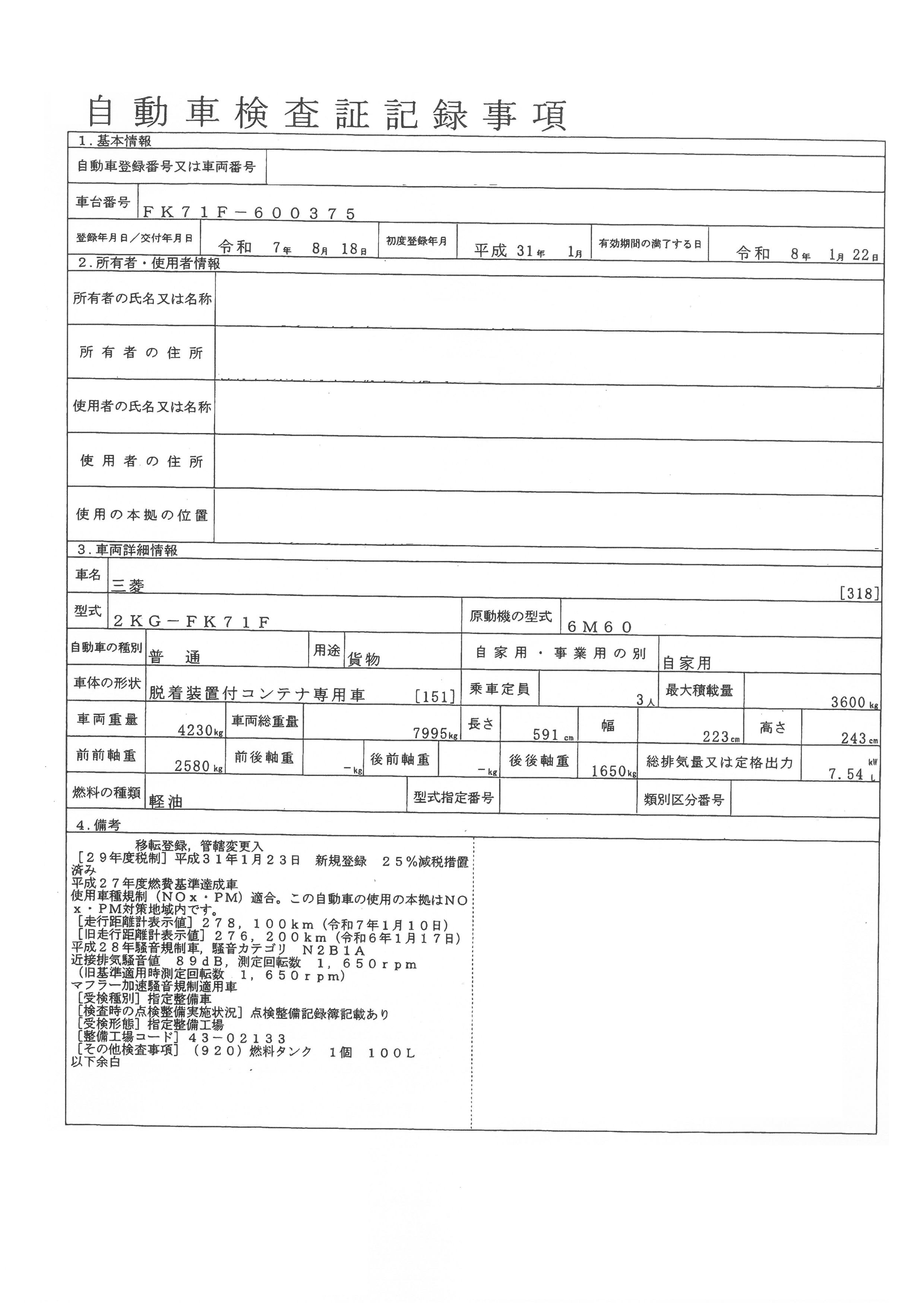 | 初年度登録 | 平成31年1月 | 型式 | 2KG-FK71F | 車検期限 | 令和8年1月22日 |