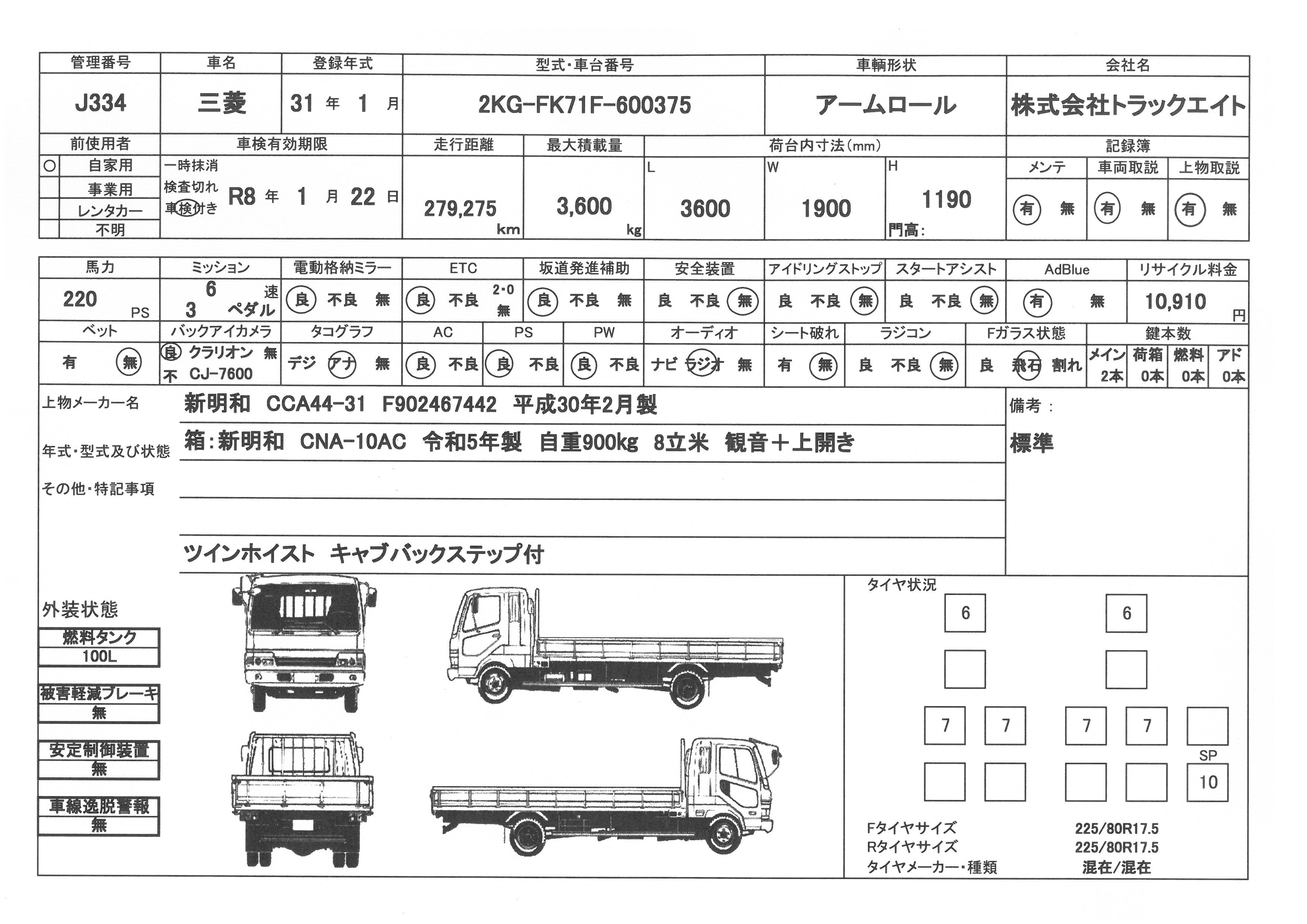 | 走行距離 | 279千km | リサイクル料 | 10910円 | 積載量 | 3600㎏ |