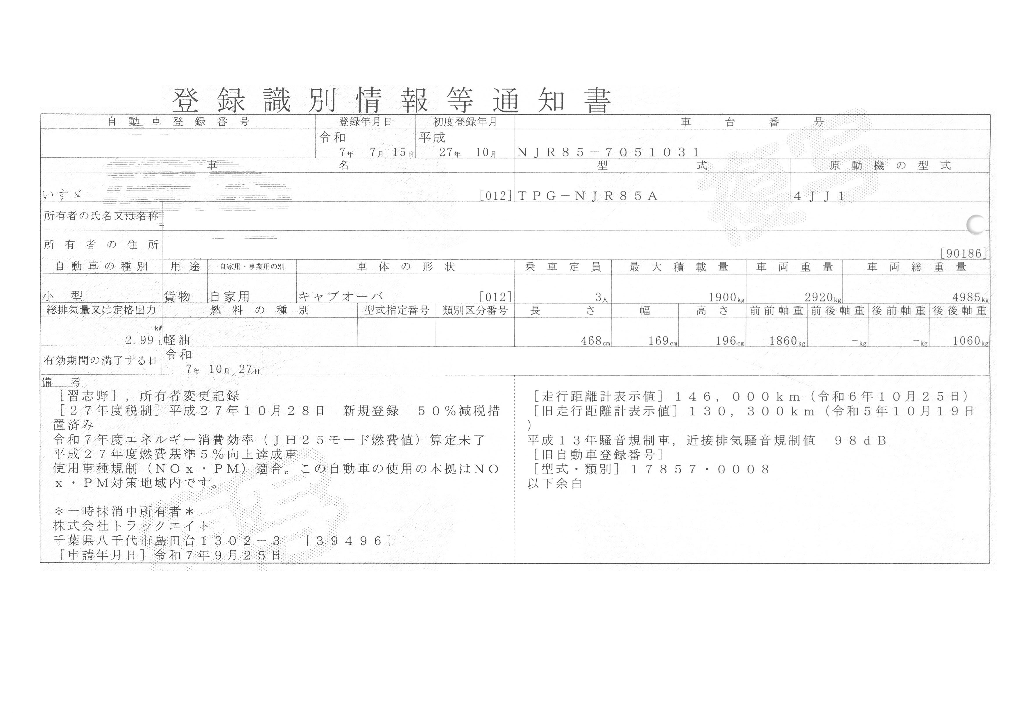 | 初年度登録 | 平成27年10月 | 型式 | TKG-NJR85A | 車検期限 | 一時抹消 |