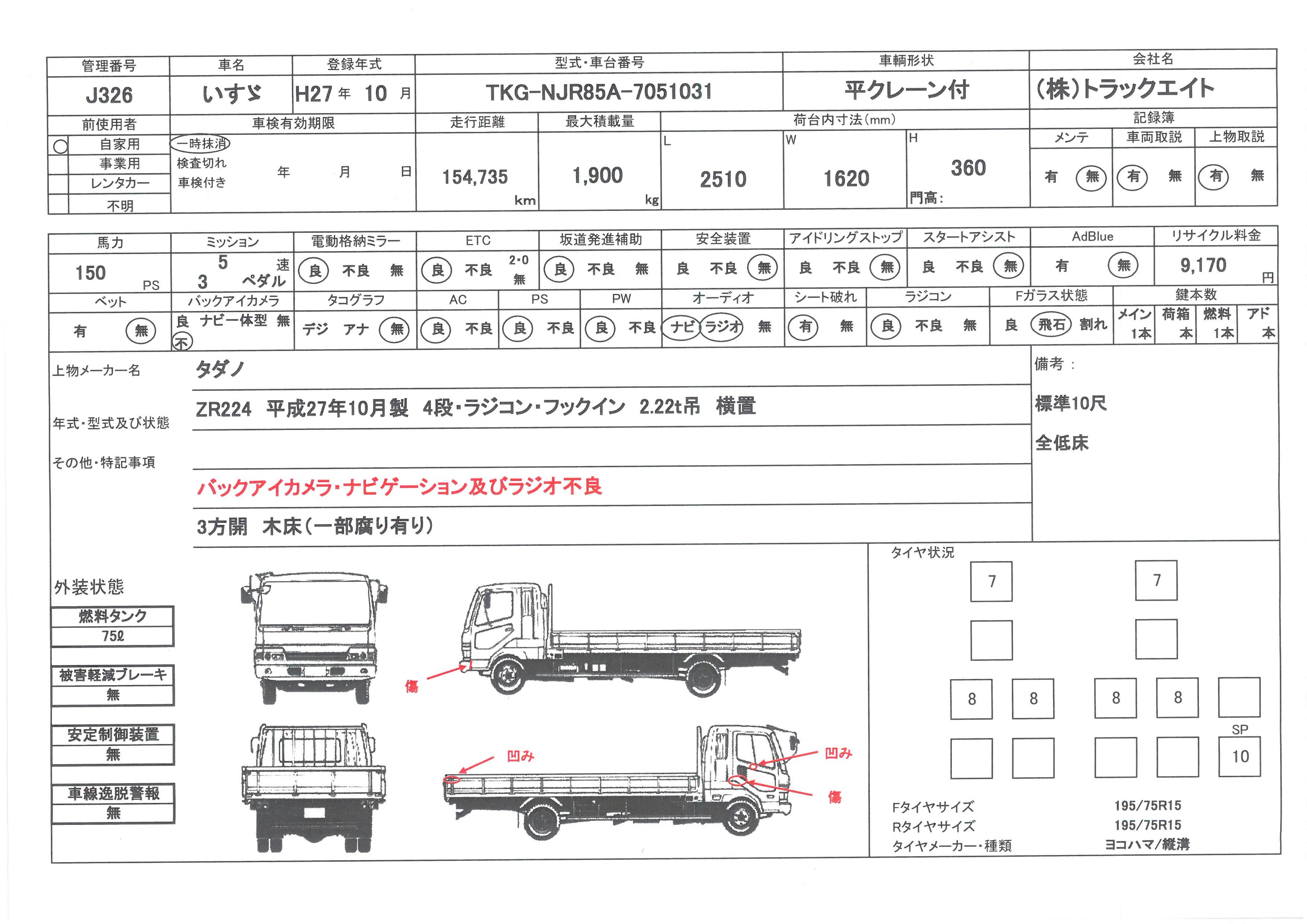 | 走行距離 | 155千km | リサイクル料 | 9170円 | 積載量 | 1900㎏ |